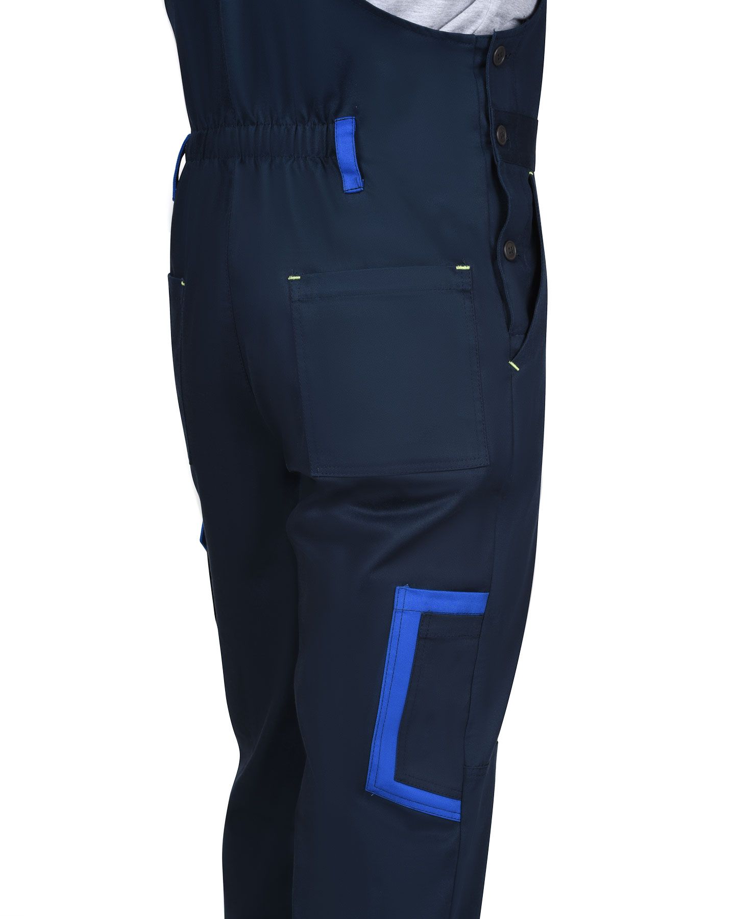 Мужской полукомбинезон. Декоративная двойная строчка контрастного цвета. Отделка контрастная на карманах и клапанах. Застёжка – молния спереди и пуговичная боковая. Регулировка спинки – частичная стяжка. Регулировка лямок – с помощью карабинов. Имеются пять накладных карманов: один на грудке, с клапаном и отстрочкой под инструмент, два больших объёмных боковых с косым входом, один сзади, один на брючине (клапан и отстрочка). Брючины оснащены наколенниками.