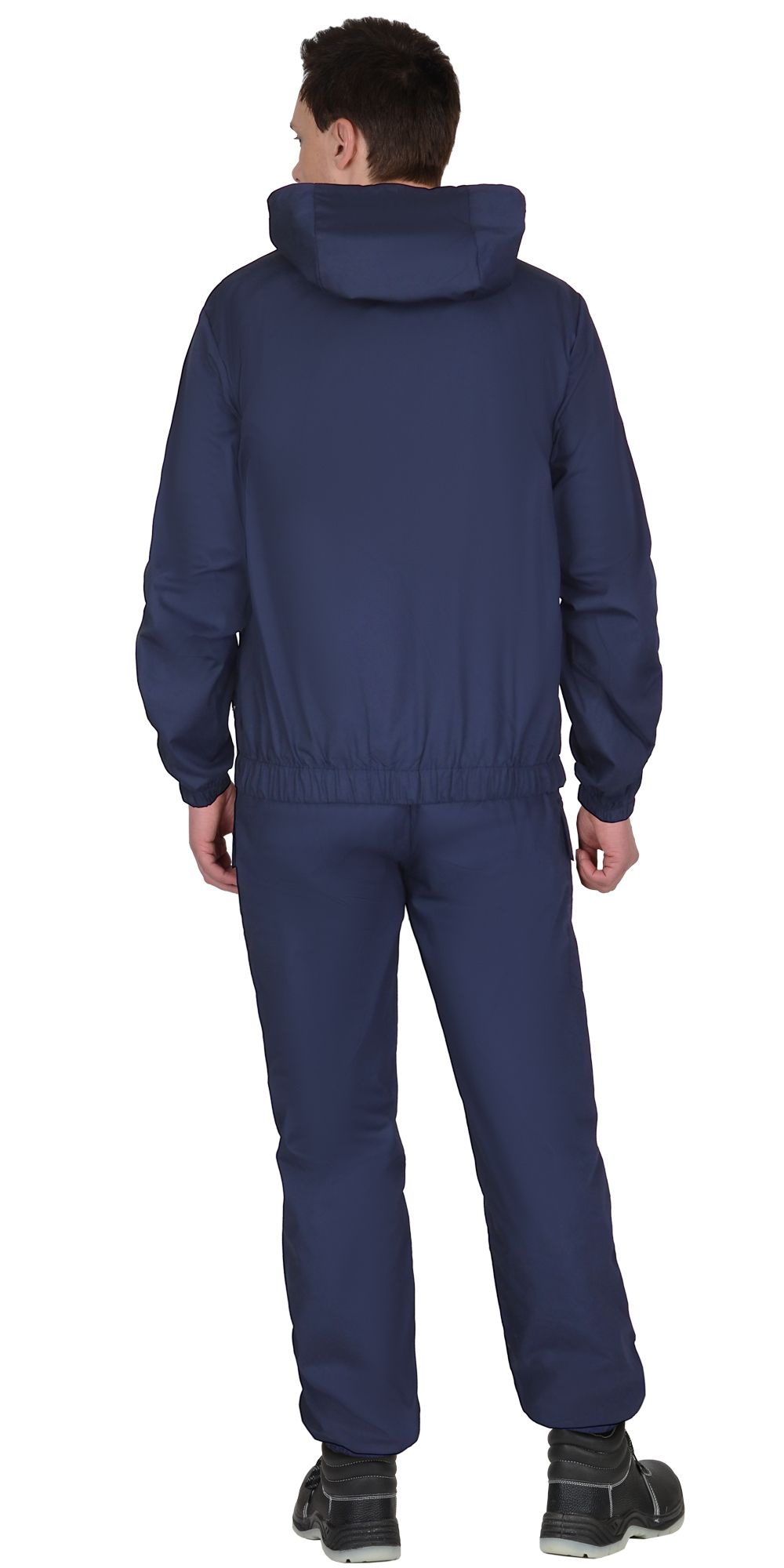Мужской костюм с курткой и брюками. Двойная декоративная строчка. Отделка светло-серая на куртке – на кокетке переда. Нижний срез кокетки с красным кантом. Красные вставки на центральной планке, на нагрудном кармане и рядом с манжетами рукавов. Куртка короткая, застёжка-молния по центру, скрытая. На спинке вертикальные складки. Отложной воротник. Карманы: в вертикальных швах и накладные на груди (с клапанами). Брюки прямые, с застёжкой-молнией и на пуговице, пояс регулируется по бокам хлястиками на липучках. Имеются два боковых кармана (вход фигурный), два задних для инструмента.