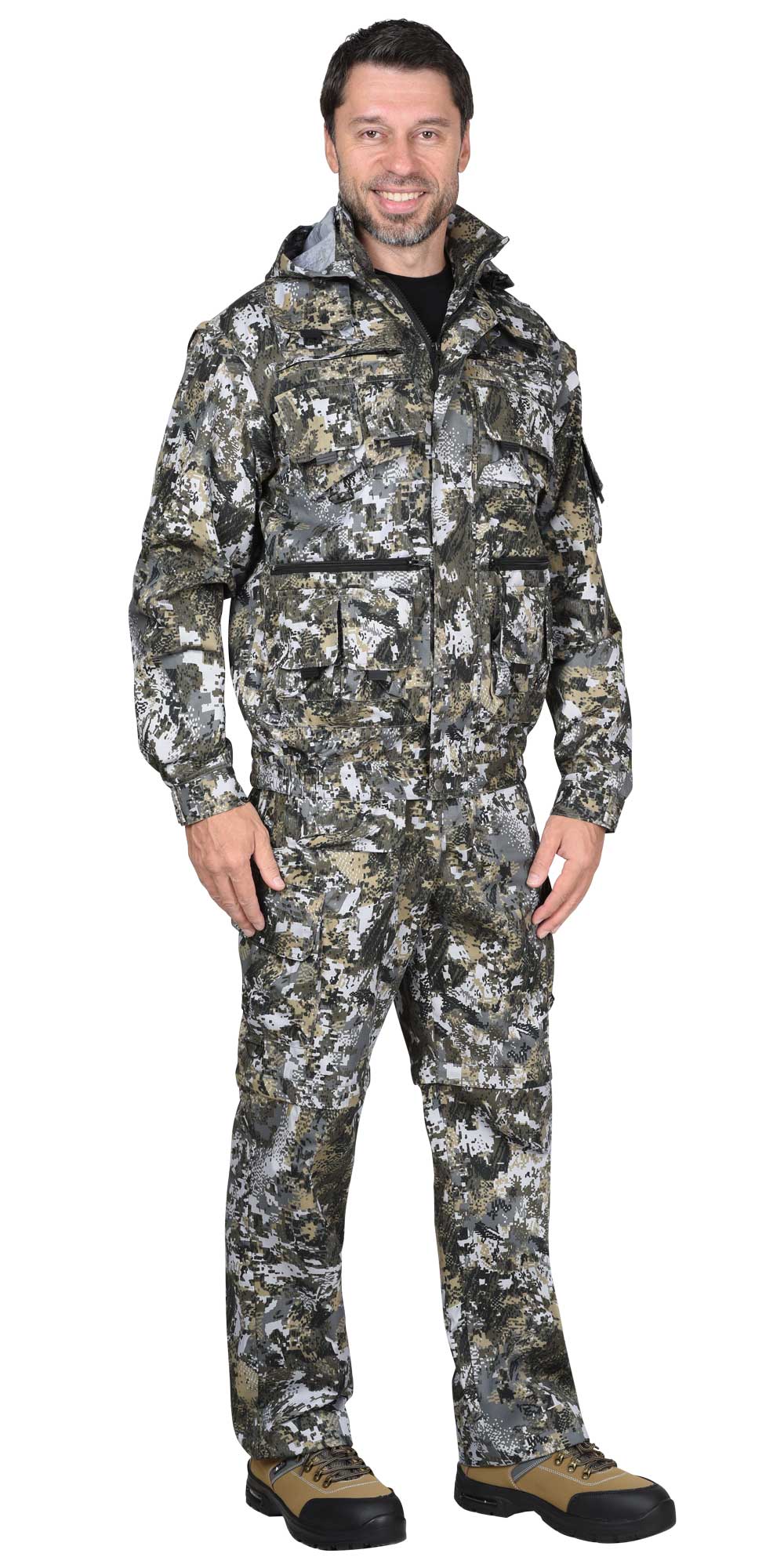 Костюм для работы в зимнее время на открытом воздухе. Ткань с водоотталкивающими свойствами. Куртка короткая с эластичной вставкой в нижней части. Манжеты тоже эластичные в форме напульсников, благодаря чему куртка не продувается через рукава и внутрь не попадает снег во время активной работы. Основная застёжка – молния. Дополнительно куртка запахивается на застёжки-липучки. Капюшон съёмный, регулируется по объёму. Воротник-стойка. На груди имеются накладные прямые карманы с клапанами, застёгивающимися на липучки. По бокам – косые открытые карманы. Полукомбинезон на эластичных бретелях с регулировкой по длине. Центральная застёжка – молния.
