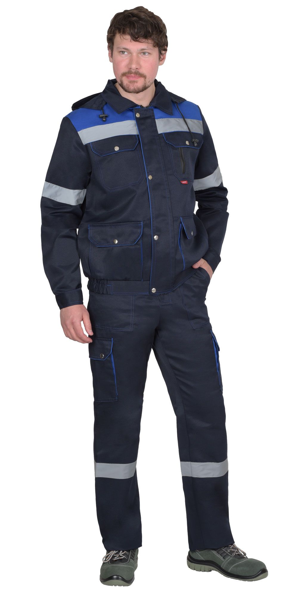 Мужской костюм с курткой и брюками. Двойная декоративная строчка. Отделка светло-серая на куртке – на кокетке переда. Нижний срез кокетки с красным кантом. Красные вставки на центральной планке, на нагрудном кармане и рядом с манжетами рукавов. Куртка короткая, застёжка-молния по центру, скрытая. На спинке вертикальные складки. Отложной воротник. Карманы: в вертикальных швах и накладные на груди (с клапанами). Брюки прямые, с застёжкой-молнией и на пуговице, пояс регулируется по бокам хлястиками на липучках. Имеются два боковых кармана (вход фигурный), два задних для инструмента.