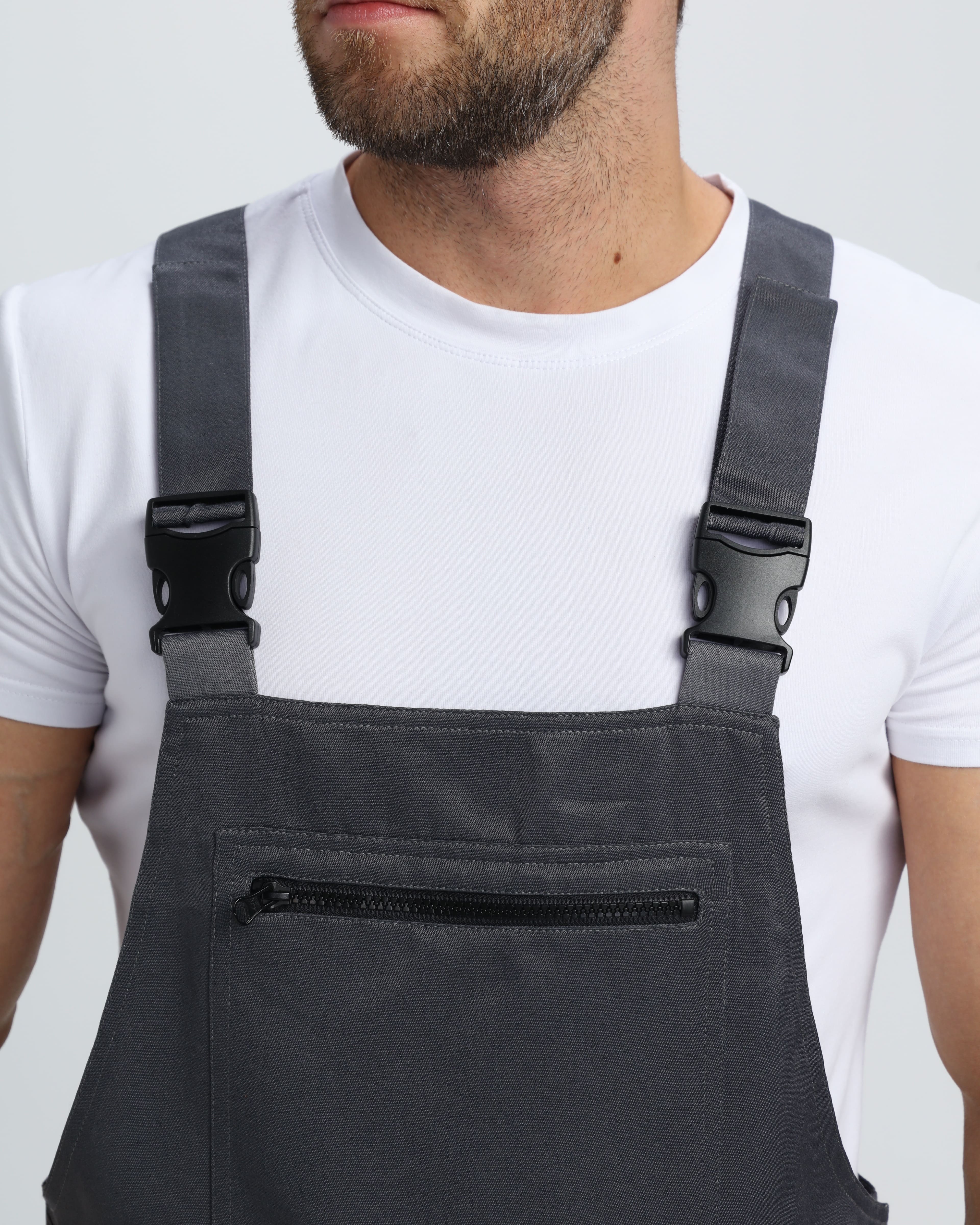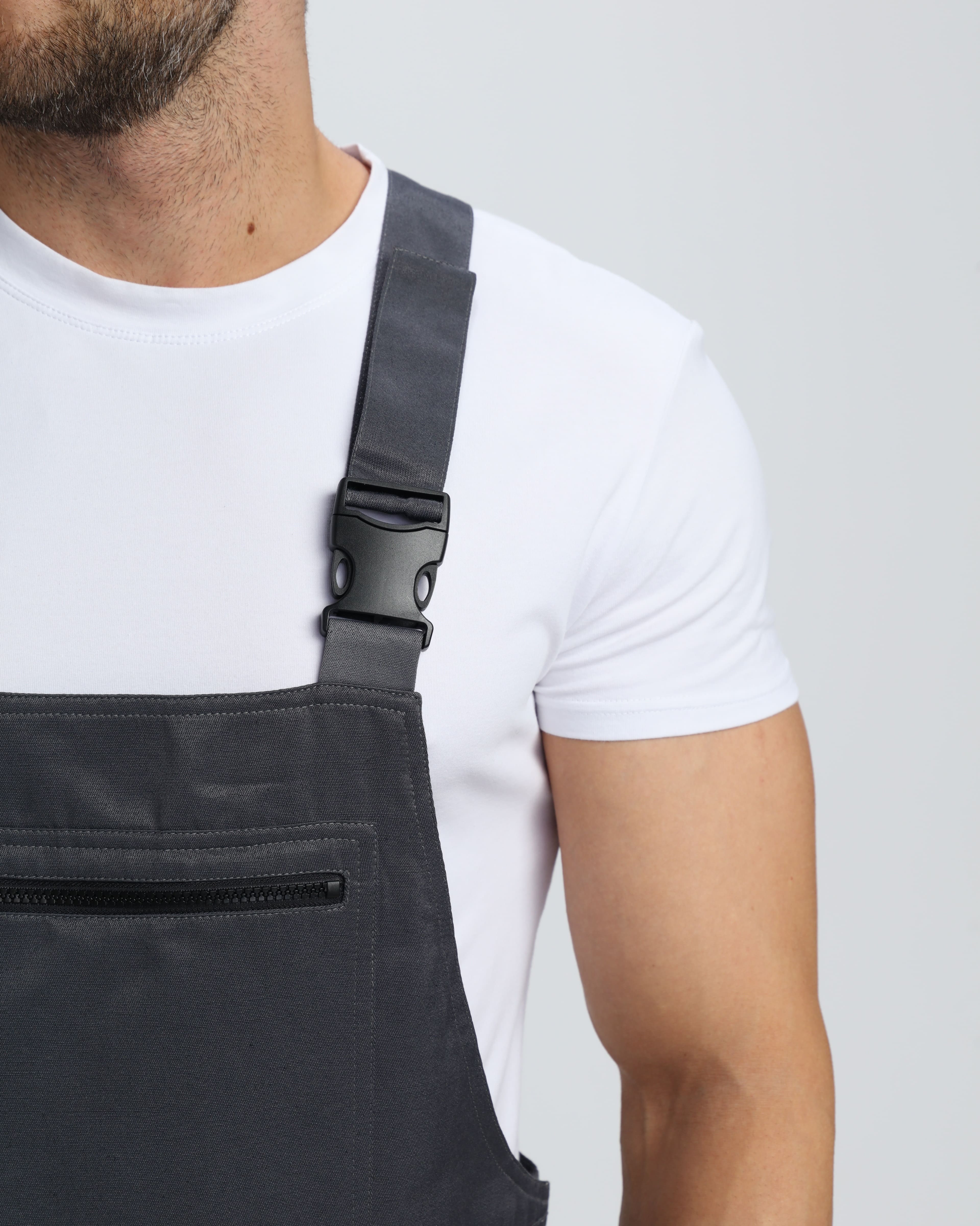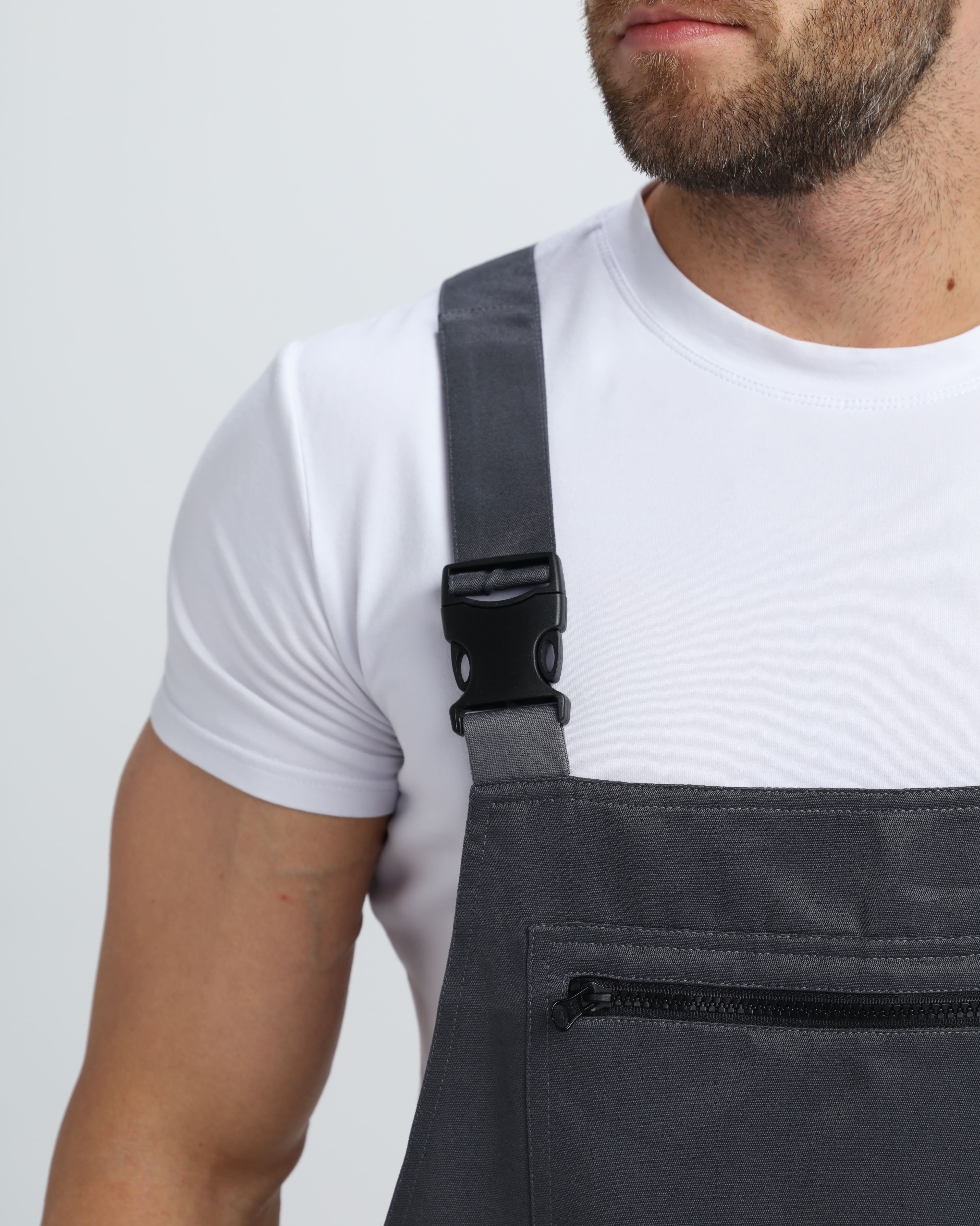 Мужской костюм: полукомбинезон и куртка. Чёрной отделкой дополнены отложной воротник, рукава, карманы на брюках, низ куртки и брючин. Красная отделка используется для кокетки (перед, спинка), клапанов. Светоотражающая полоса – на кокетке, полочках, рукавах и брючинах. Застёгивается на молнию по центру, дополнительно имеется контактная лента. Низ – на кнопке, эластичен по бокам. Вертикальные складки спинки. Имеются карманы: пара нагрудных (из них один с клапаном), пара боковых. Полукомбинезон: на бретелях и в талии – резинка, регулировка лямок карабинами. Карманы: на грудке – многофункциональный, боковые – накладные (с усилением), дополнительный под инструмент. Брючины оснащены усилительными накладками.
