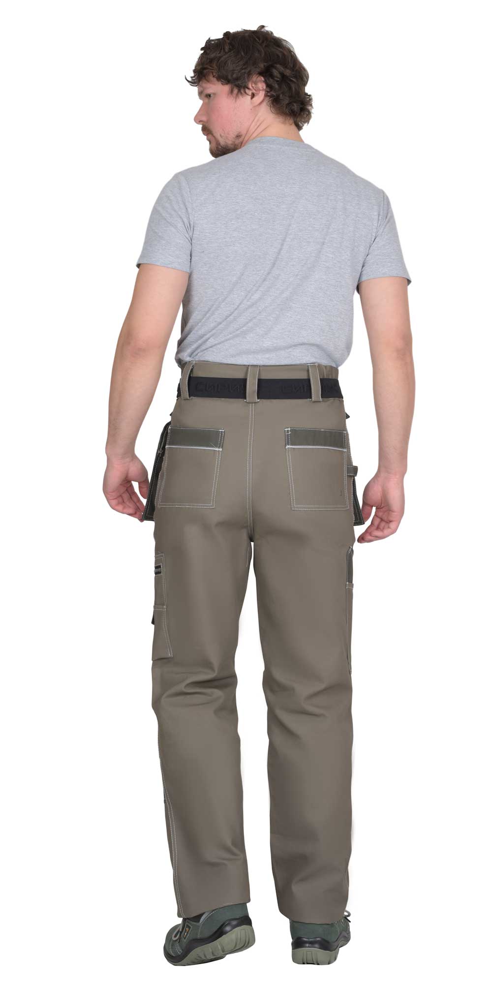 Задние половинки с накладными карманами и патой для инструментов. Пояс широкий, застегивается на 2 пуговицы, с резинкой по боковым швам.