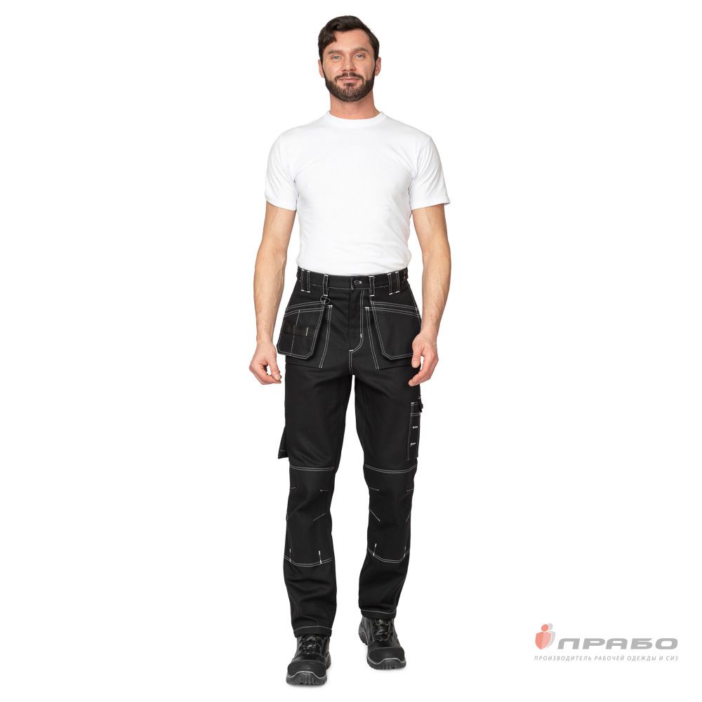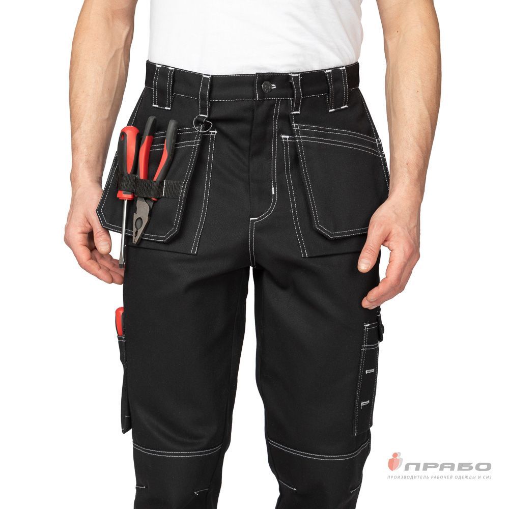 Брюки: прямого силуэта анатомического кроя, с застёжкой гульфика на молнию, пояс со шлёвками для ношения ремня, наколенники с карманами для амортизационных вкладышей. Объём пояса регулируется эластичной лентой на задней части пояса.