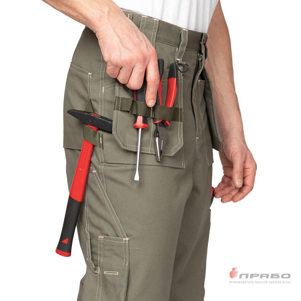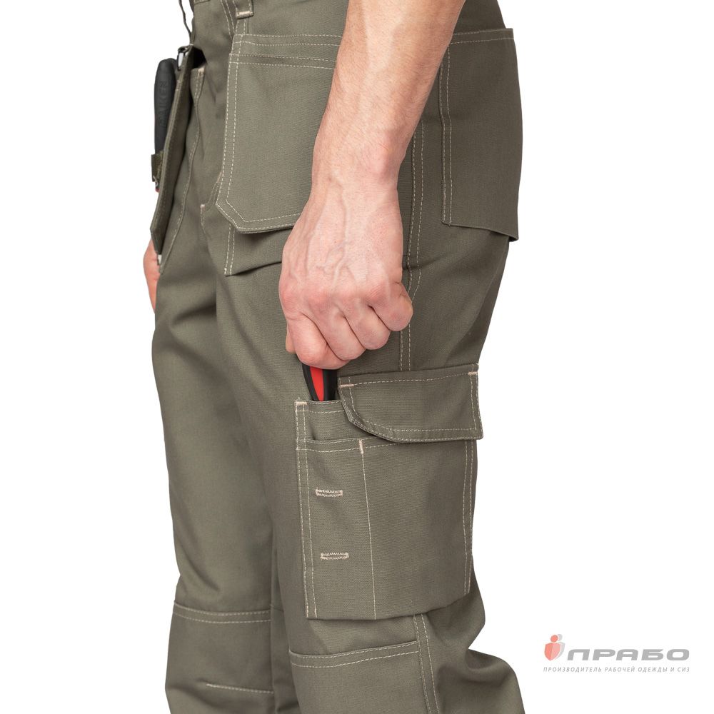Брюки: прямого силуэта анатомического кроя, с застёжкой гульфика на молнию, пояс с шлёвками для ношения ремня, наколенники с карманами для амортизационных вкладышей. Объём пояса регулируется эластичной лентой на задней части пояса.