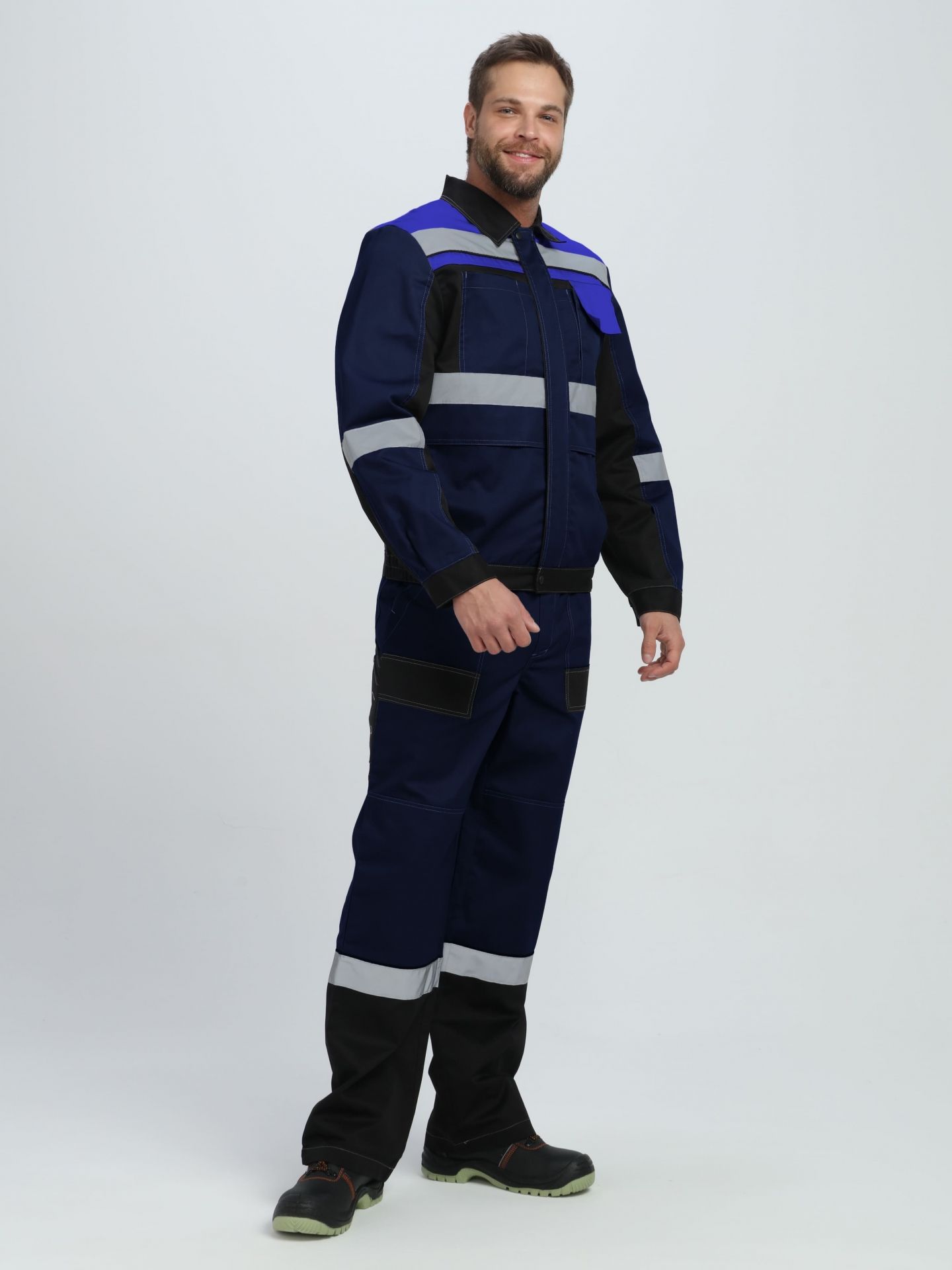 • Наличие светоотражающих полос на кокетках, полочках, спинке, рукавах и брючинах, обеспечивающих видимость в условиях низкой освещённости.