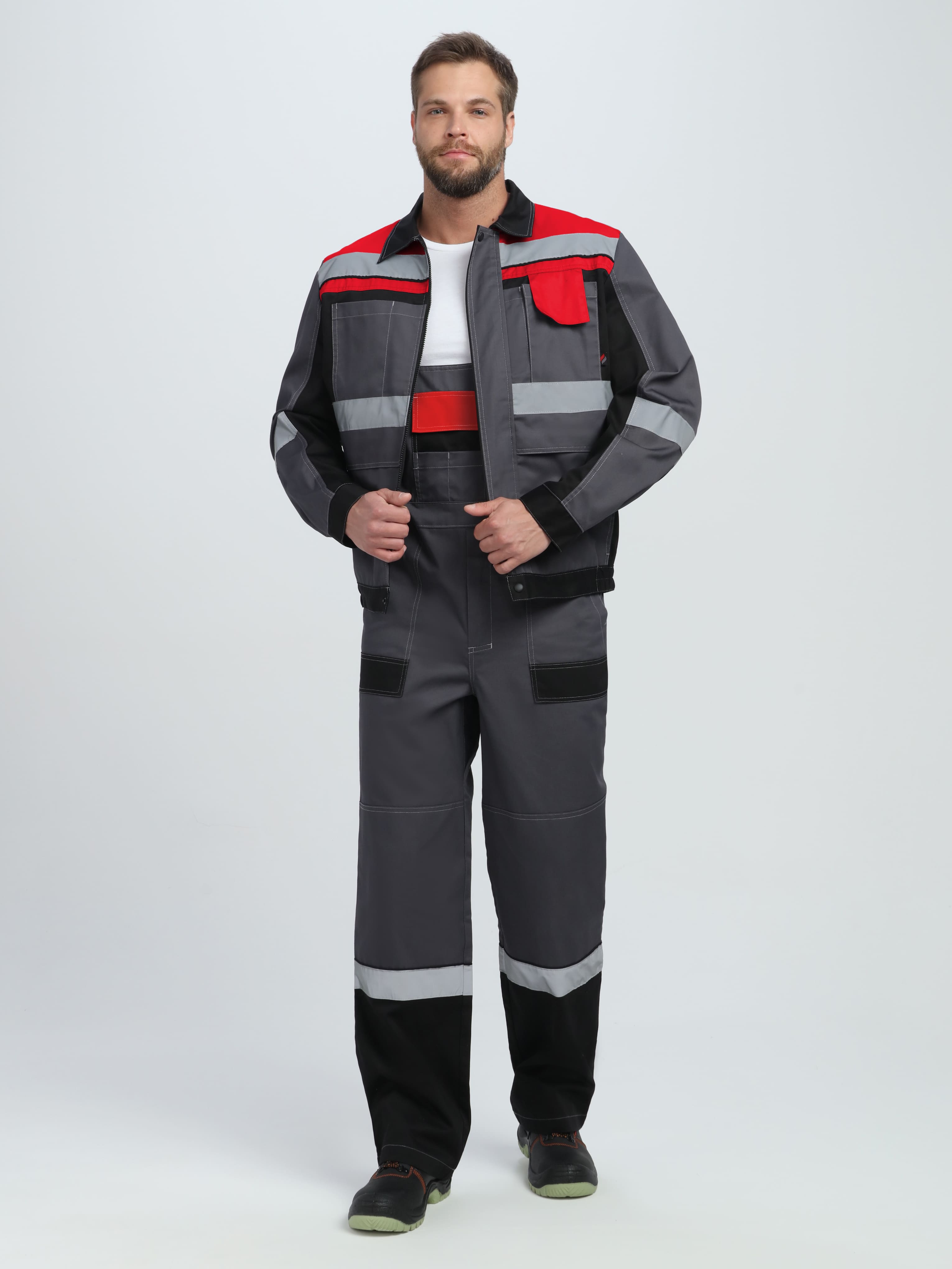 Мужской костюм: полукомбинезон и куртка. Чёрной отделкой дополнены отложной воротник, рукава, карманы на брюках, низ куртки и брючин. Красная отделка используется для кокетки (перед, спинка), клапанов. Светоотражающая полоса – на кокетке, полочках, рукавах и брючинах. Застёгивается на молнию по центру, дополнительно имеется контактная лента. Низ – на кнопке, эластичен по бокам. Вертикальные складки спинки. Имеются карманы: пара нагрудных (из них один с клапаном), пара боковых. Полукомбинезон: на бретелях и в талии – резинка, регулировка лямок карабинами. Карманы: на грудке – многофункциональный, боковые – накладные (с усилением), дополнительный под инструмент. Брючины оснащены усилительными накладками.
