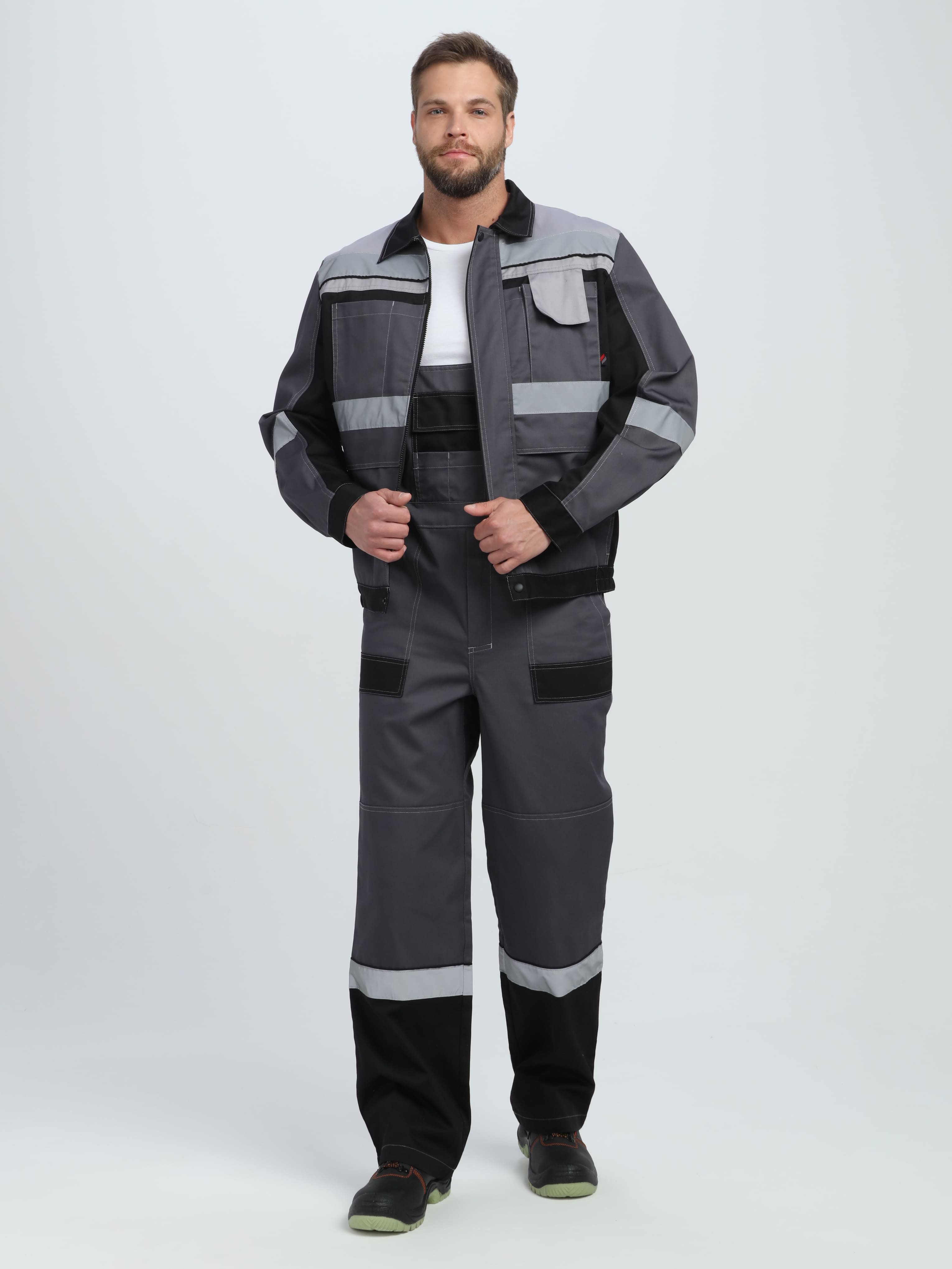 Мужской костюм: полукомбинезон и куртка. Чёрной отделкой дополнены отложной воротник, рукава, карманы на брюках, низ куртки и брючин. Красная отделка используется для кокетки (перед, спинка), клапанов. Светоотражающая полоса – на кокетке, полочках, рукавах и брючинах. Застёгивается на молнию по центру, дополнительно имеется контактная лента. Низ – на кнопке, эластичен по бокам. Вертикальные складки спинки. Имеются карманы: пара нагрудных (из них один с клапаном), пара боковых. Полукомбинезон: на бретелях и в талии – резинка, регулировка лямок карабинами. Карманы: на грудке – многофункциональный, боковые – накладные (с усилением), дополнительный под инструмент. Брючины оснащены усилительными накладками.