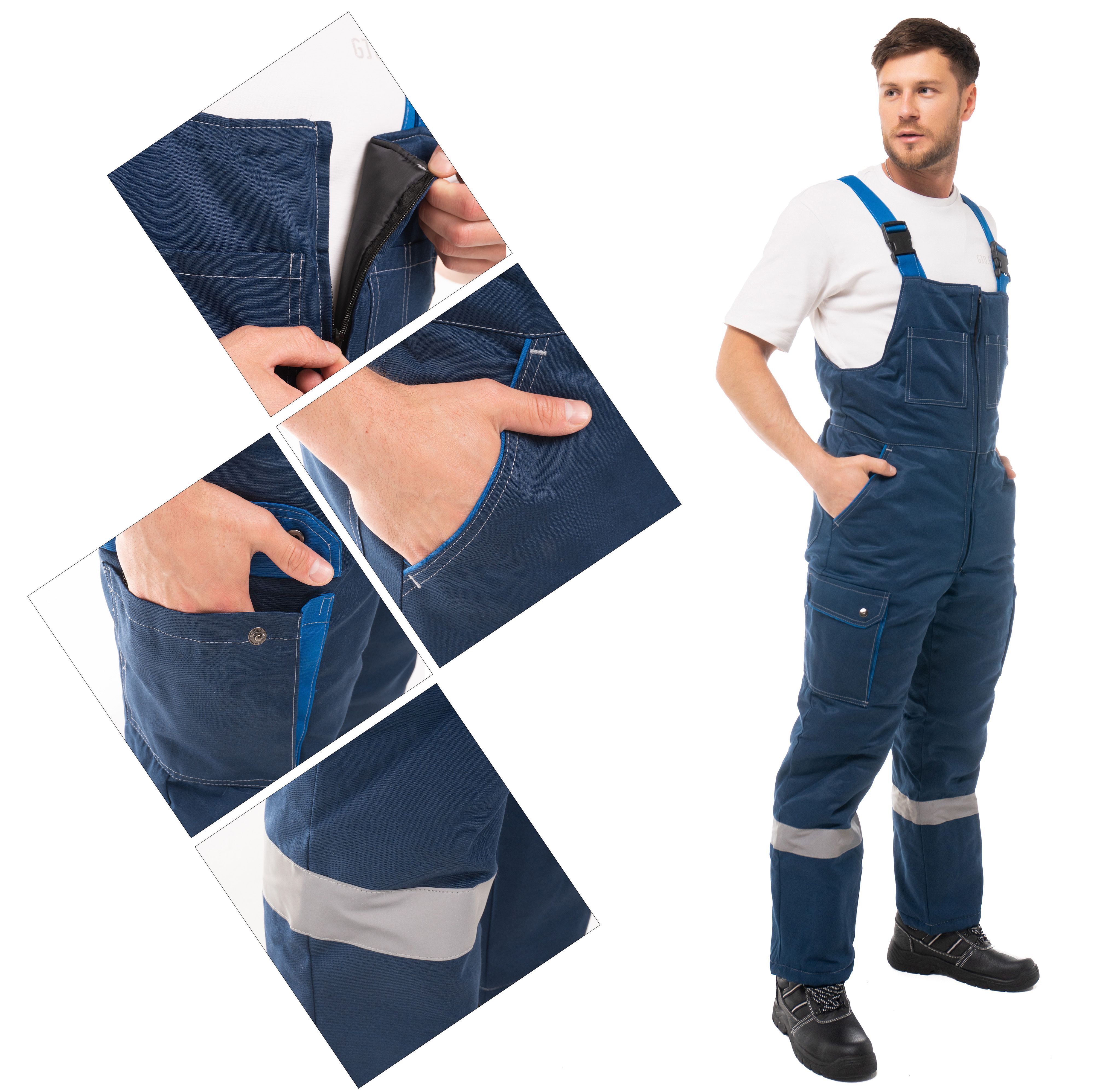 Полукомбинезон прямой, утепленный, стеганный, с притачной утеплённой подкладкой, с цельнокроеной грудкой и спинкой, с центральной застёжкой на 2-х замковую тесьму - "молнию" и ветрозащитным клапаном, с регулируемыми бретелями.