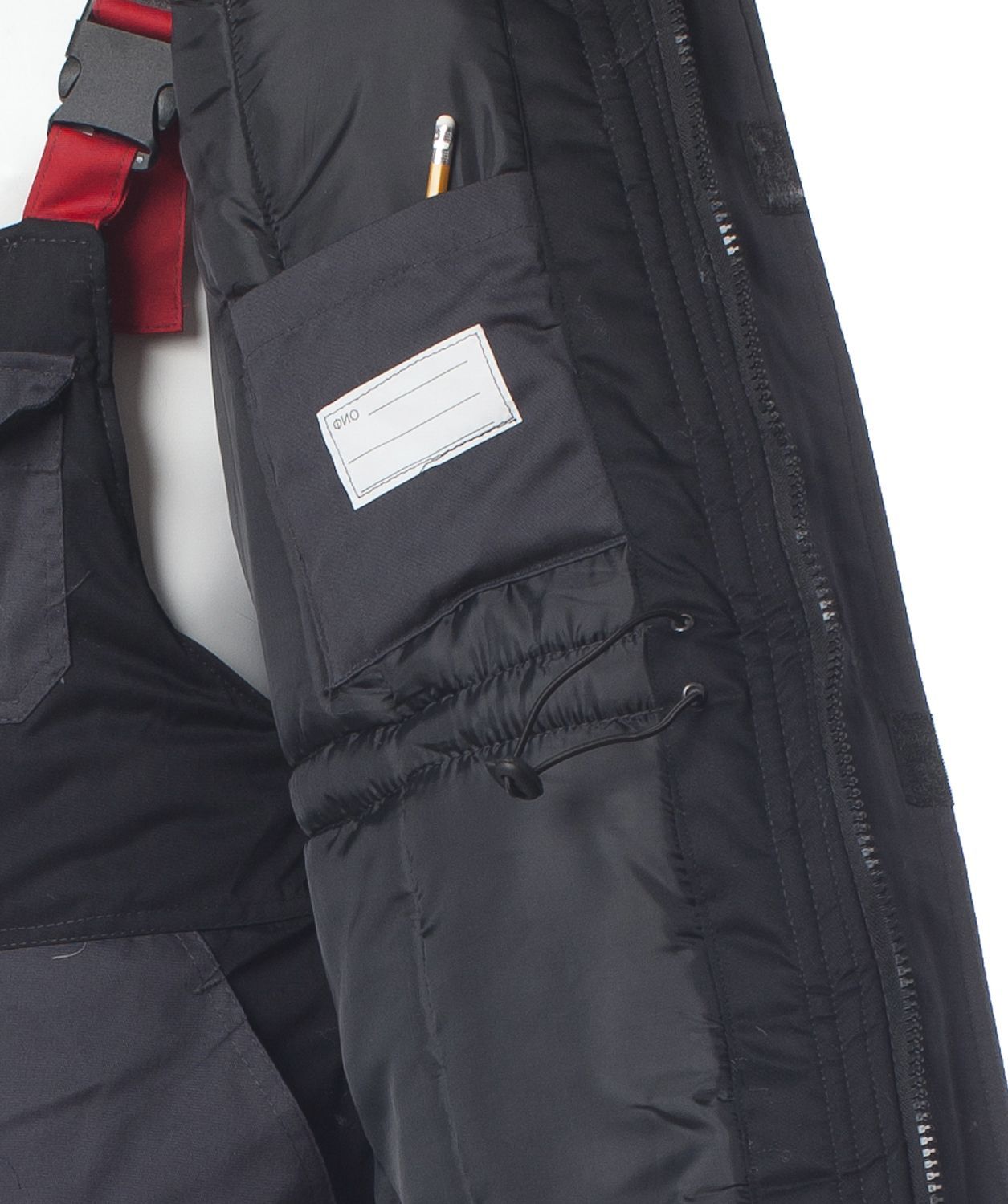Костюм для работы в зимнее время на открытом воздухе. Ткань с водоотталкивающими свойствами. Куртка короткая с эластичной вставкой в нижней части. Манжеты тоже эластичные в форме напульсников, благодаря чему куртка не продувается через рукава и внутрь не попадает снег во время активной работы. Основная застёжка – молния. Дополнительно куртка запахивается на застёжки-липучки. Капюшон съёмный, регулируется по объёму. Воротник-стойка. На груди имеются накладные прямые карманы с клапанами, застёгивающимися на липучки. По бокам – косые открытые карманы. Полукомбинезон на эластичных бретелях с регулировкой по длине. Центральная застёжка – молния.