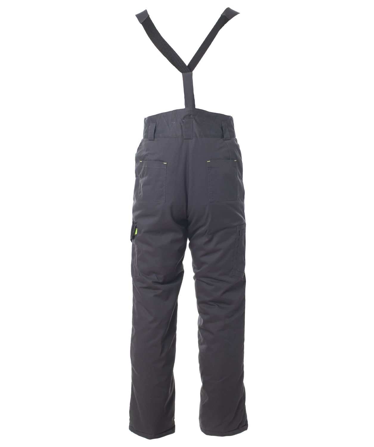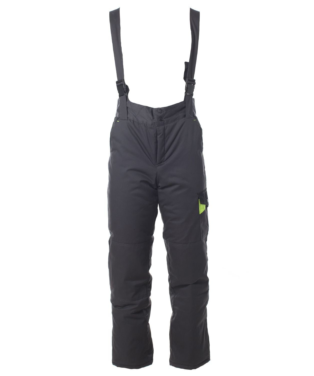 Полукомбинезон прямой, утепленный, стеганный, с притачной утеплённой подкладкой, с цельнокроеной грудкой и спинкой, с центральной застёжкой на 2-х замковую тесьму - "молнию" и ветрозащитным клапаном, с регулируемыми бретелями.