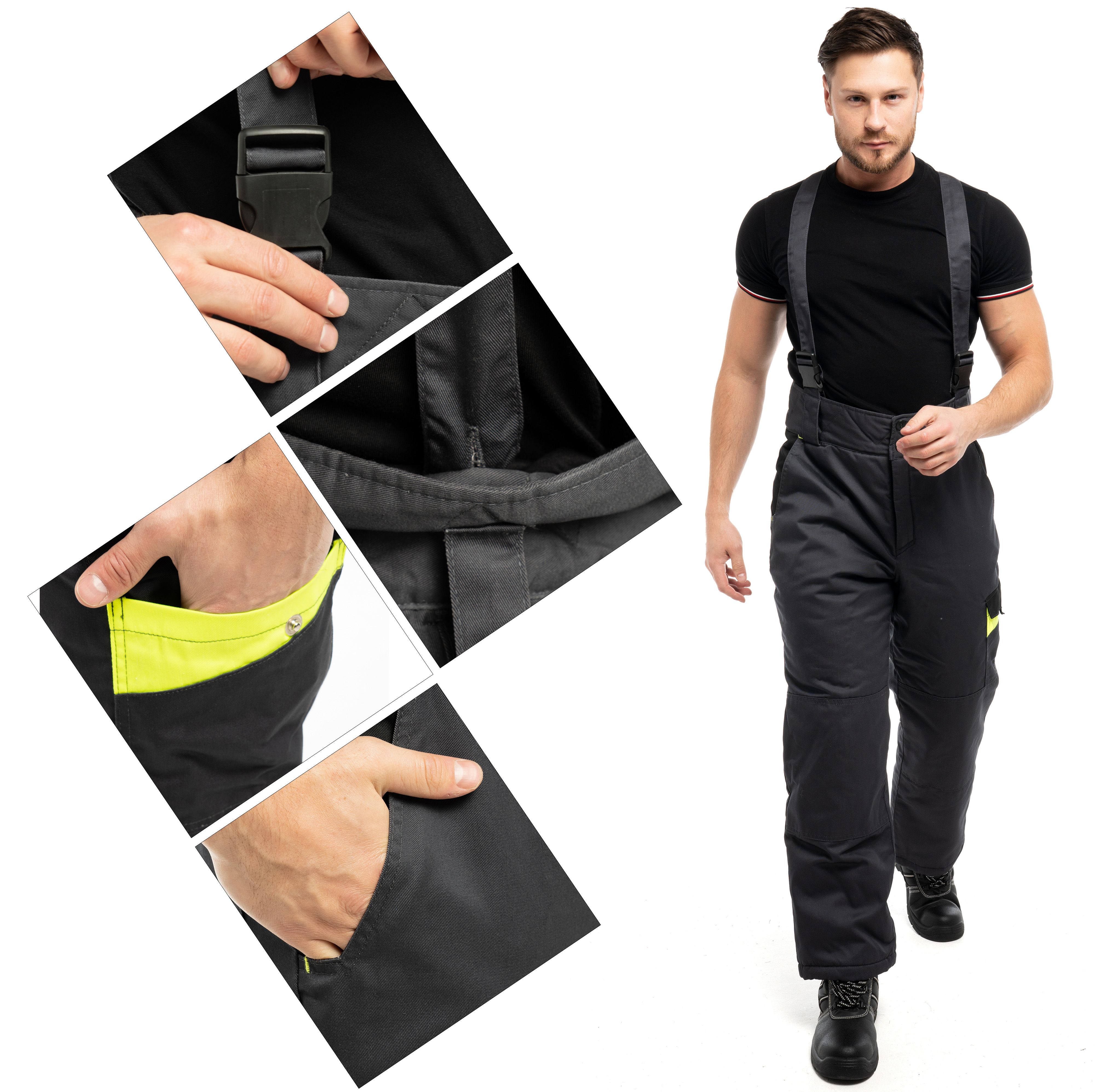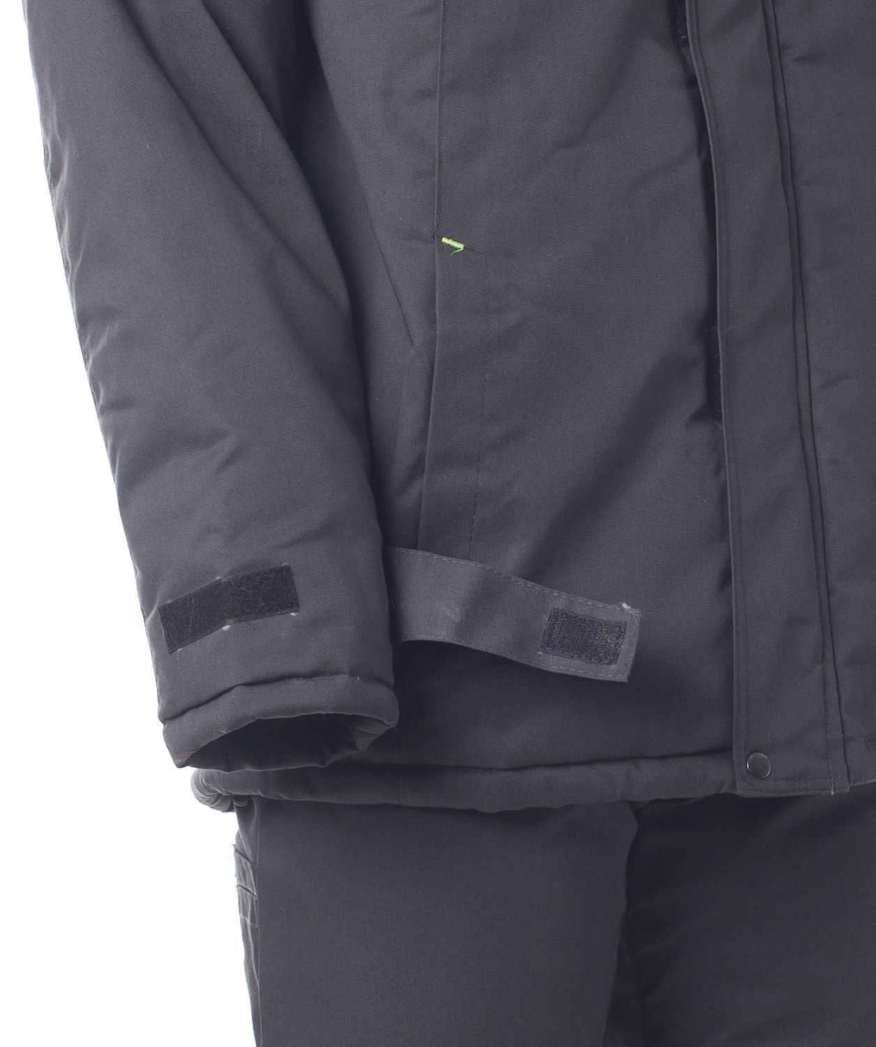 Костюм для работы в зимнее время на открытом воздухе. Ткань с водоотталкивающими свойствами. Куртка короткая с эластичной вставкой в нижней части. Манжеты тоже эластичные в форме напульсников, благодаря чему куртка не продувается через рукава и внутрь не попадает снег во время активной работы. Основная застёжка – молния. Дополнительно куртка запахивается на застёжки-липучки. Капюшон съёмный, регулируется по объёму. Воротник-стойка. На груди имеются накладные прямые карманы с клапанами, застёгивающимися на липучки. По бокам – косые открытые карманы. Полукомбинезон на эластичных бретелях с регулировкой по длине. Центральная застёжка – молния.