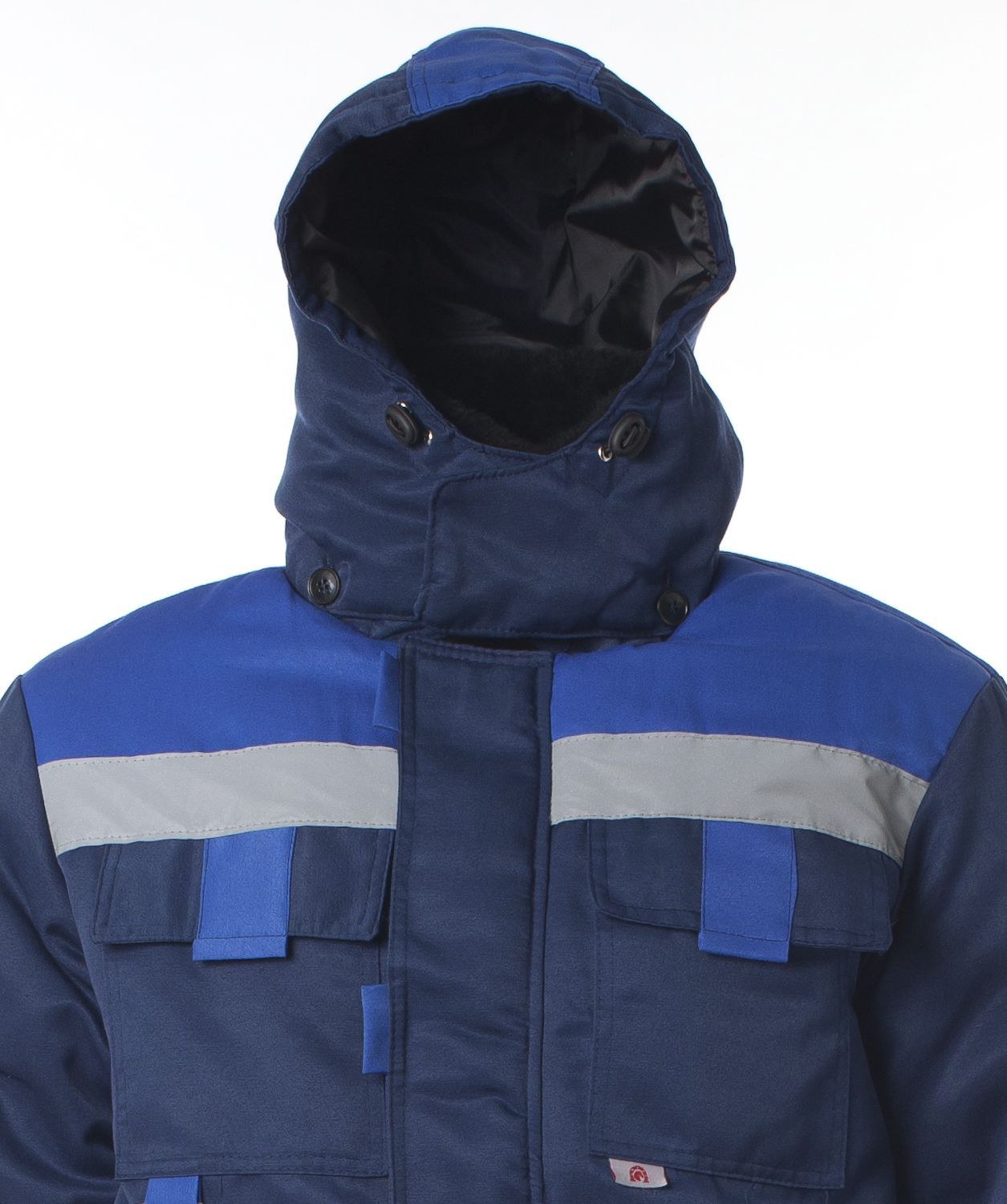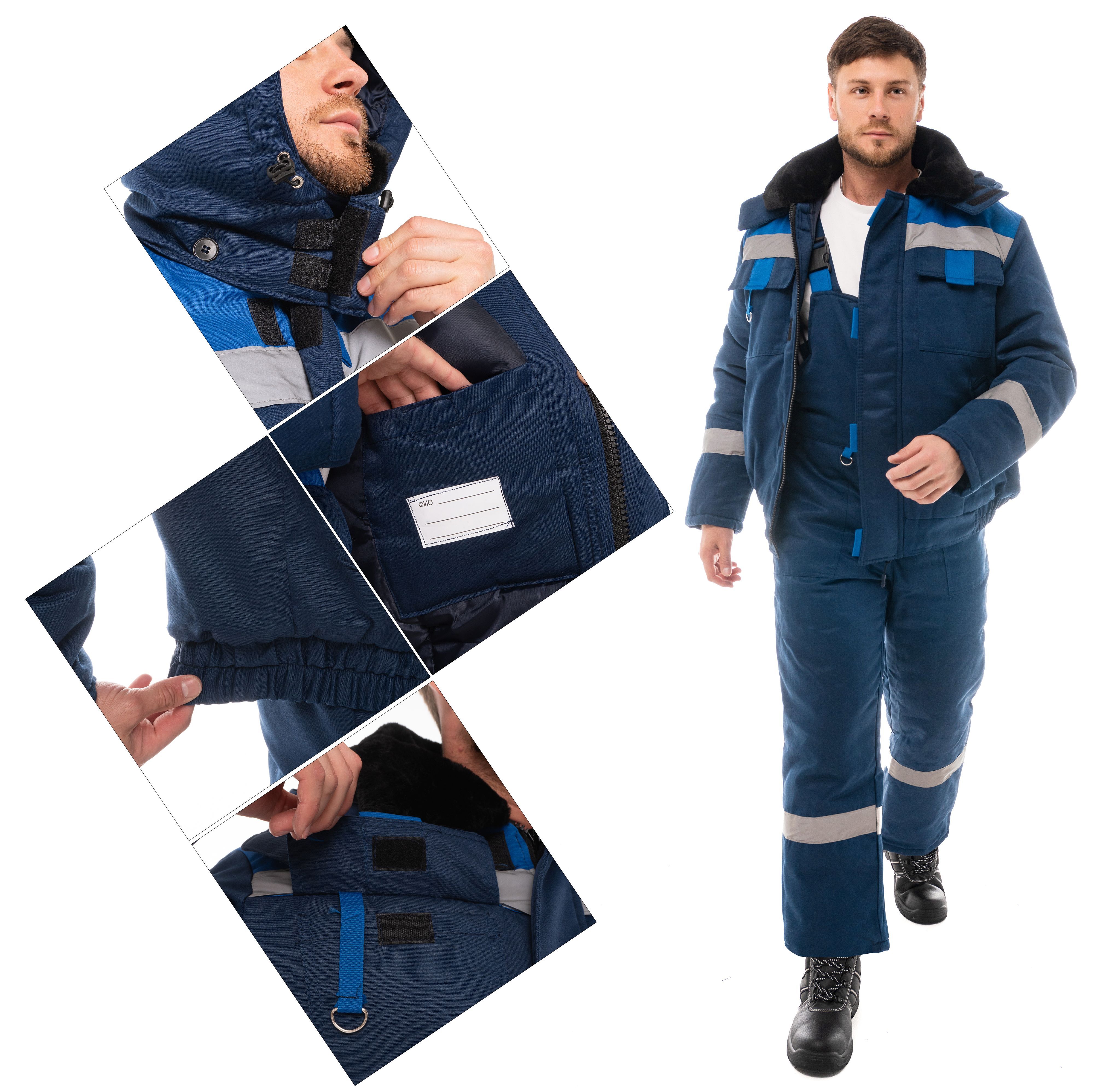 Костюм для работы в зимнее время на открытом воздухе. Ткань с водоотталкивающими свойствами. Куртка короткая с эластичной вставкой в нижней части. Манжеты тоже эластичные в форме напульсников, благодаря чему куртка не продувается через рукава и внутрь не попадает снег во время активной работы. Основная застёжка – молния. Дополнительно куртка запахивается на застёжки-липучки. Капюшон съёмный, регулируется по объёму. Воротник-стойка. На груди имеются накладные прямые карманы с клапанами, застёгивающимися на липучки. По бокам – косые открытые карманы. Полукомбинезон на эластичных бретелях с регулировкой по длине. Центральная застёжка – молния.