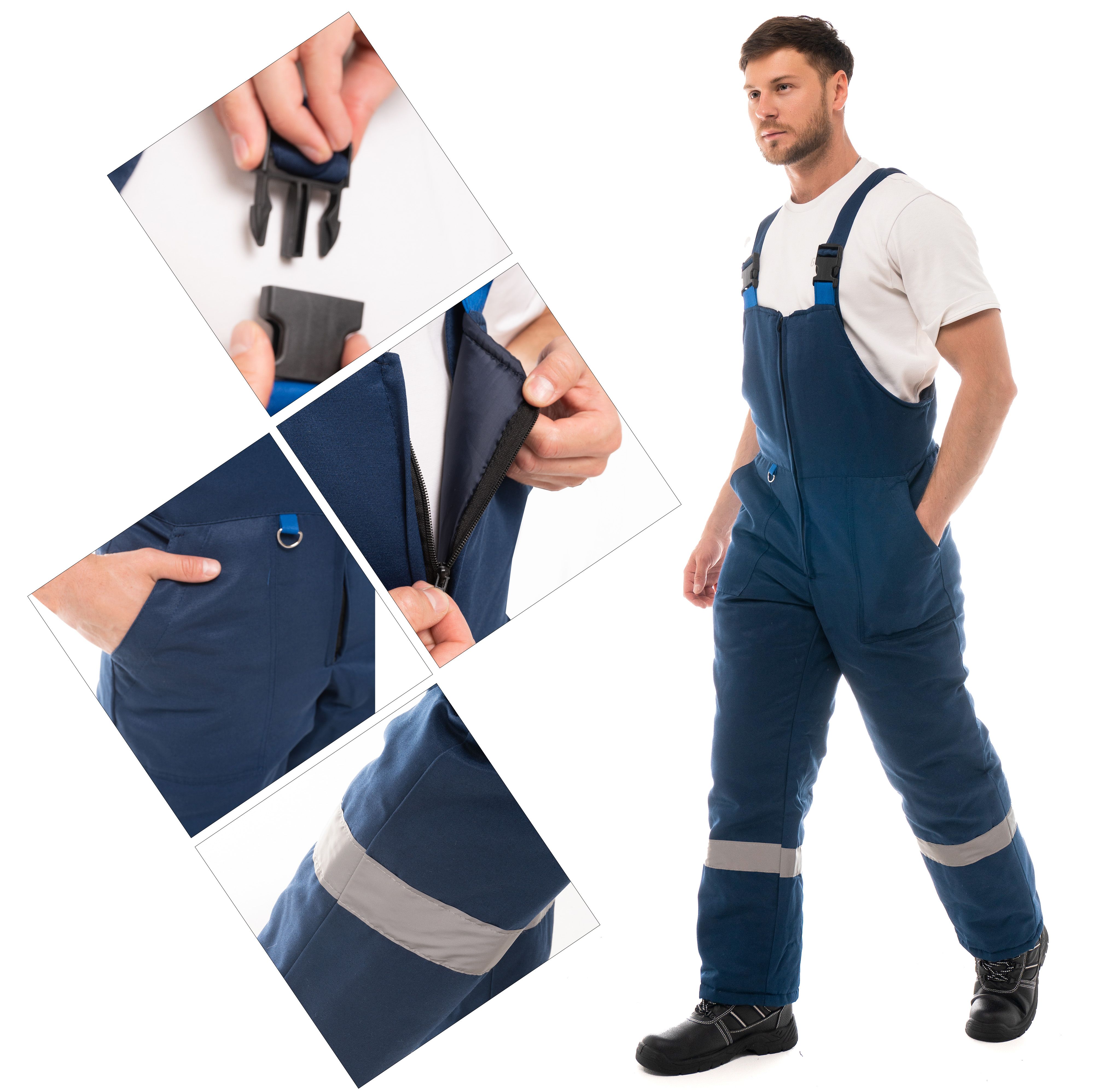 Полукомбинезон утепленный, с центральной застежкой на тесьму “молния”.