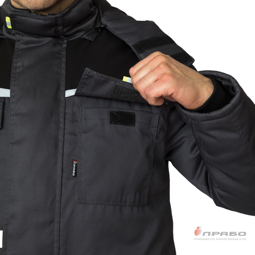Куртка длинная прямого силуэта, с притачной утеплённой подкладкой, центральной застёжкой на 2-х замковую тесьму - "молнию", ветрозащитной планкой, воротник - "стойка", со съемным капюшоном, с комбинированным правым нагрудным карманом, застегивающимся на тесьму "молния", с левым объемным накладным карманом с клапаном застегивающимся на ленту "контакт" 1 шт длиной 5,0 см и декоративной патой из ленты СОП, с нижними утепленными накладными карманами с объемностью по низу и наклонным входом с утепленным нижним клапаном. Рукава втачные, утепленные, стеганные, с трикотажной манжетой на подкладке. В куртке предусмотрены кант готовый СВМ 3 мм светоотражающий 100К и лента светоотражающая СОП (серая) ш.50 мм.