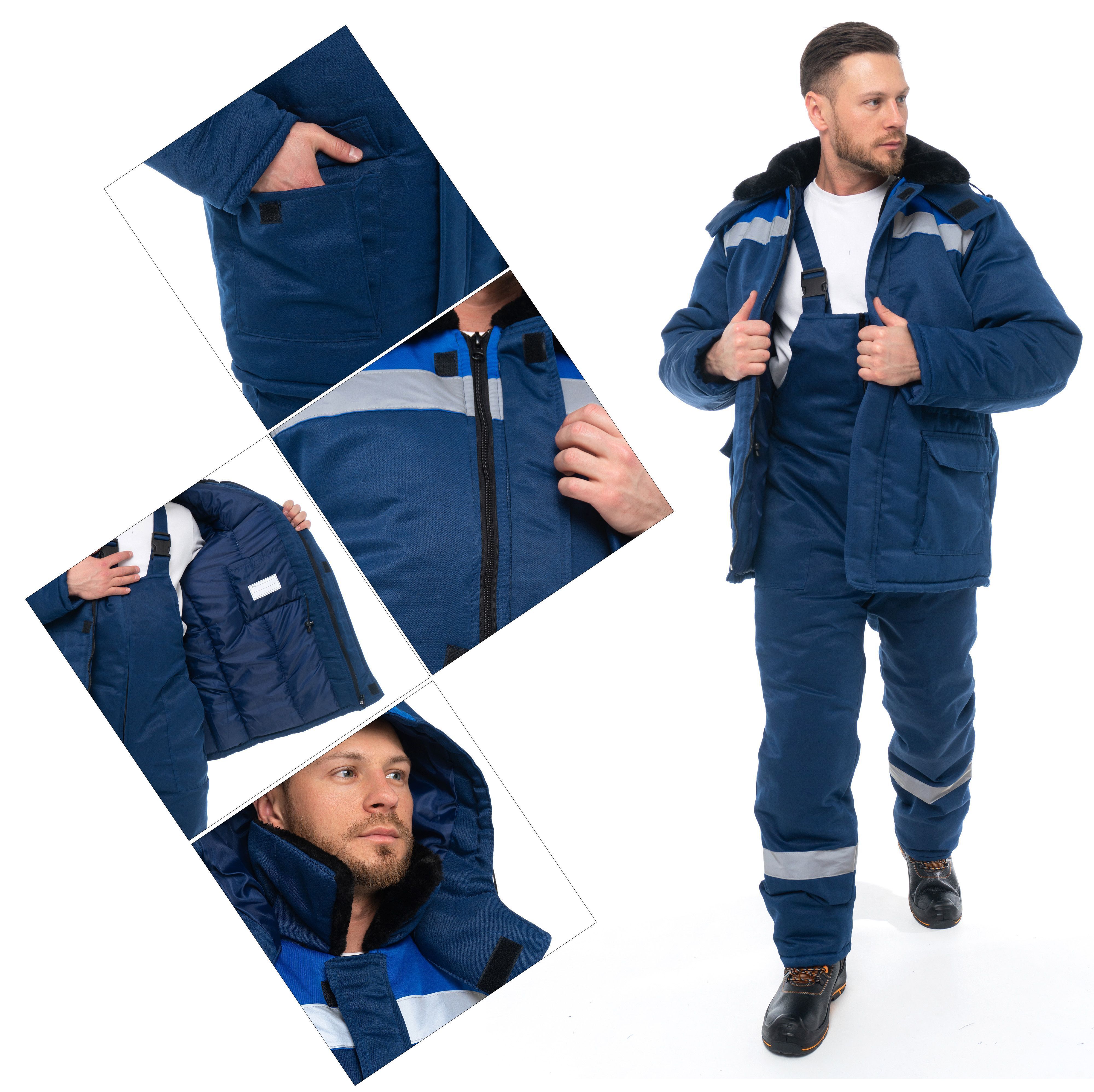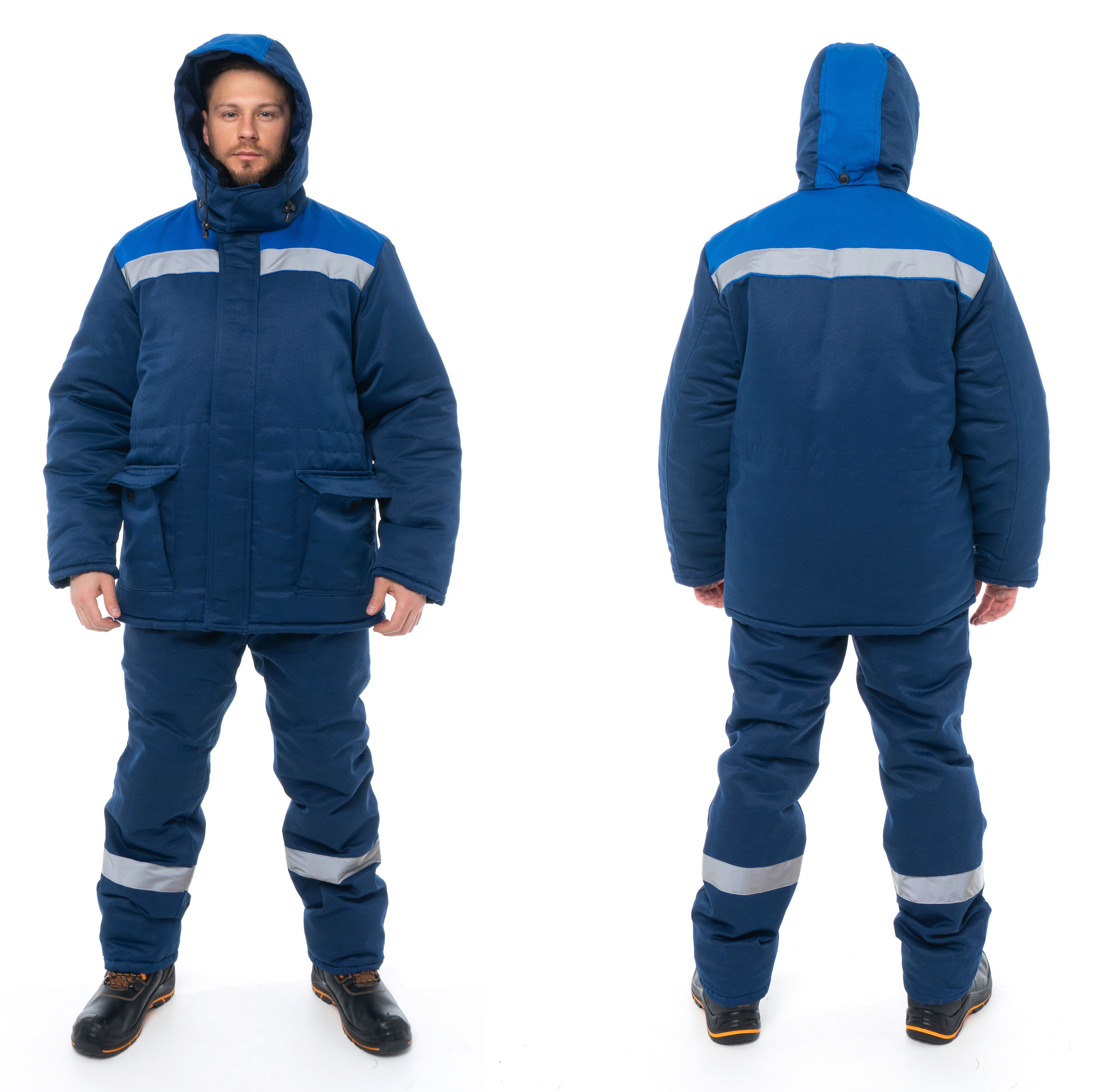 Комплект состоит из тёплой куртки и полукомбинезона. Костюм рассчитан на эксплуатацию в морозы на открытом воздухе и в неотапливаемых помещениях. Ткань устойчива к механическим воздействиям. Куртка отличается удлинённым кроем, хорошо защищает поясницу от продувания. Застёгивается на молнию с удобным большим язычком. Центральная застёжка защищена накладным ветрозащитным клапаном. В верхней части расположены косые врезные карманы. В нижней – вместительные накладные с клапаном на кнопках. Полукомбинезон оснащён эластичной вставкой в талии. Лямки регулируются пряжками по длине.