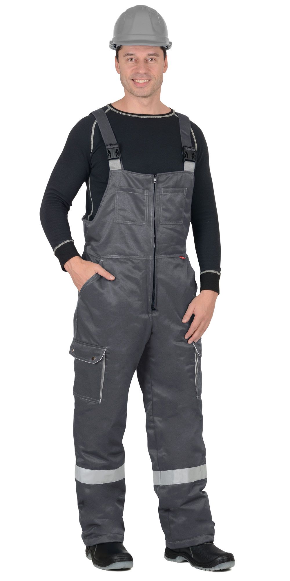 Полукомбинезон прямой, утепленный, стеганный, с притачной утеплённой подкладкой, с цельнокроеной грудкой и спинкой, с центральной застёжкой на 2-х замковую тесьму - "молнию" и ветрозащитным клапаном, с регулируемыми бретелями.