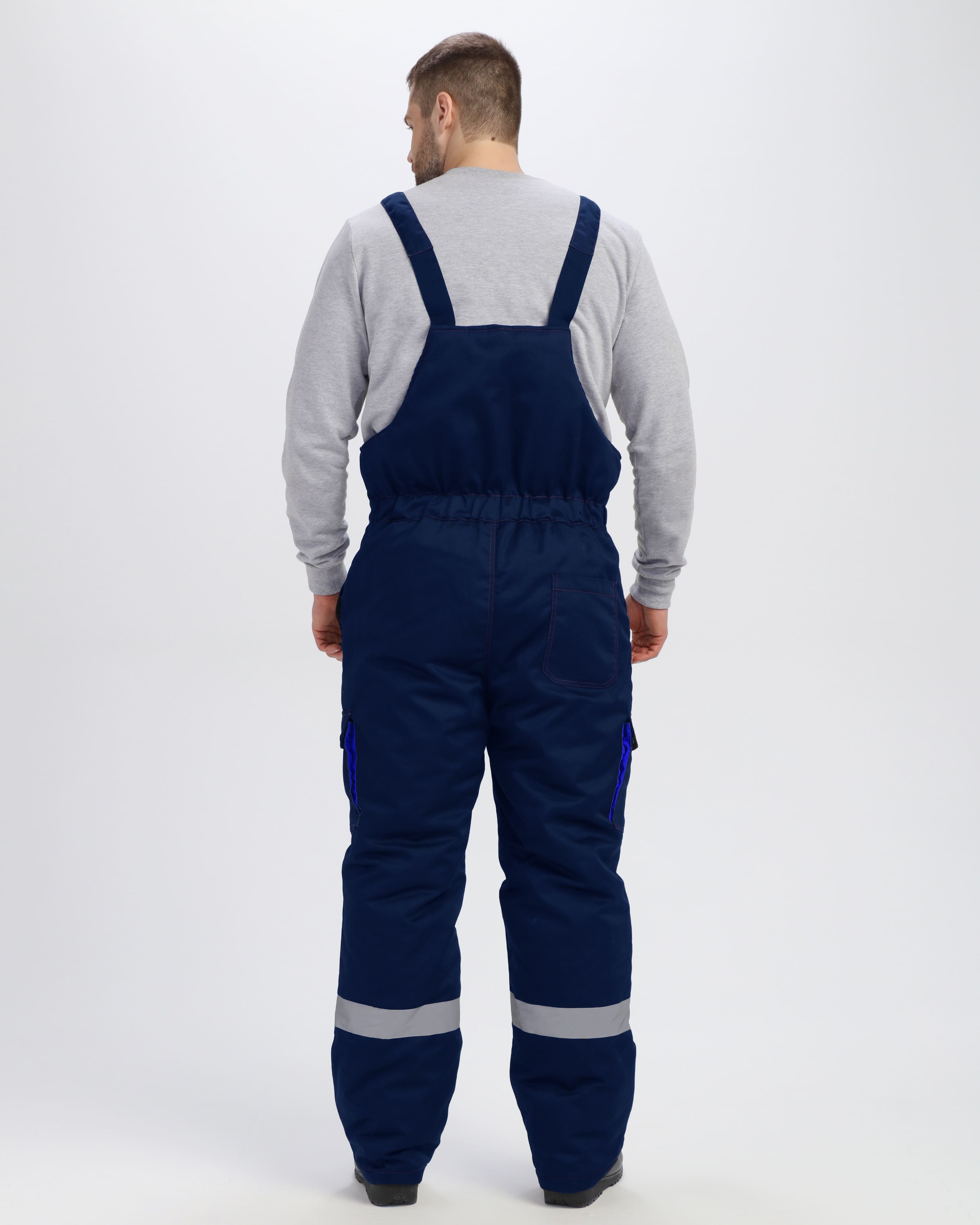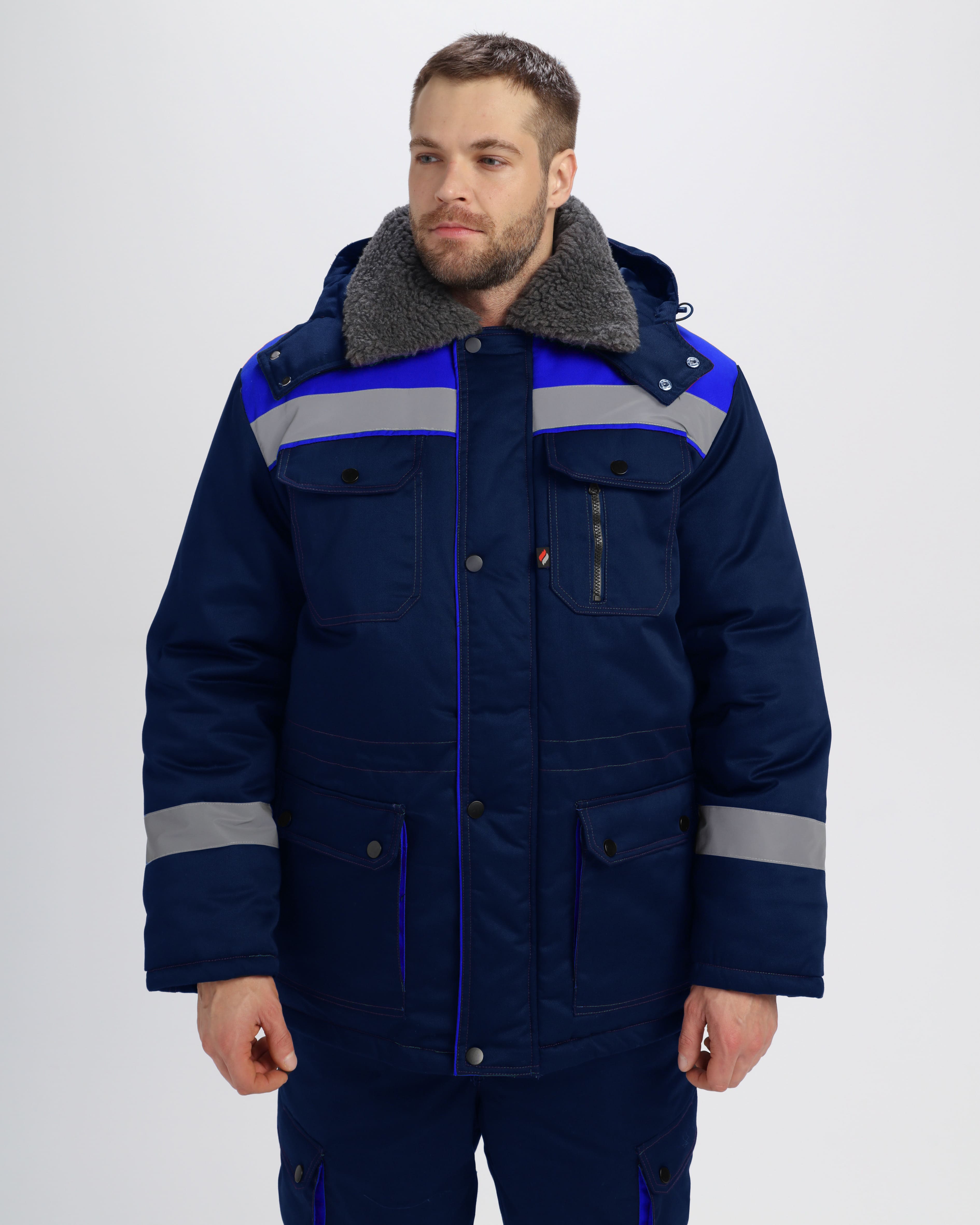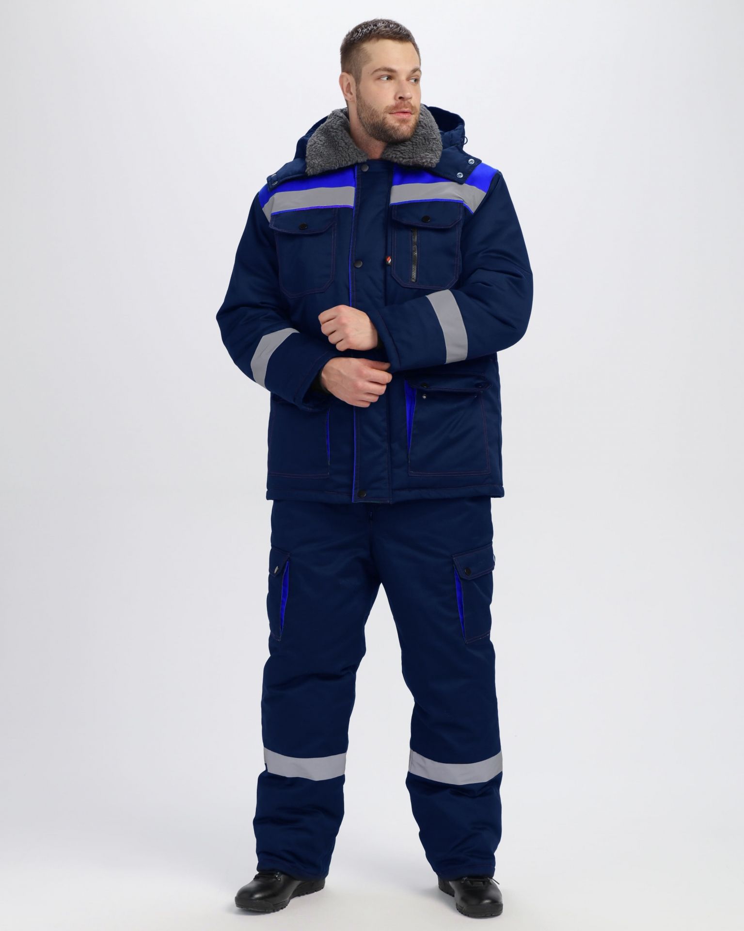В комплект входят брюки на бретельках и удлинённая куртка с утяжками. Костюм подходит для использования на стройке, в автомастерских и на производствах в зимнее время. На груди, спине и в нижней части брюк имеются вставки из светоотражающего материала, повышающие заметность работника ночью. Воротник с отворотом, отделан мехом. При необходимости его можно поднимать для защиты шеи от ветра. Имеется капюшон с утяжками и застёжкой. На куртке предусмотрены нагрудный накладной карман под рацию и два больших кармана в нижней части. В области талии имеется утяжка. Куртка застёгивается на пуговицы.