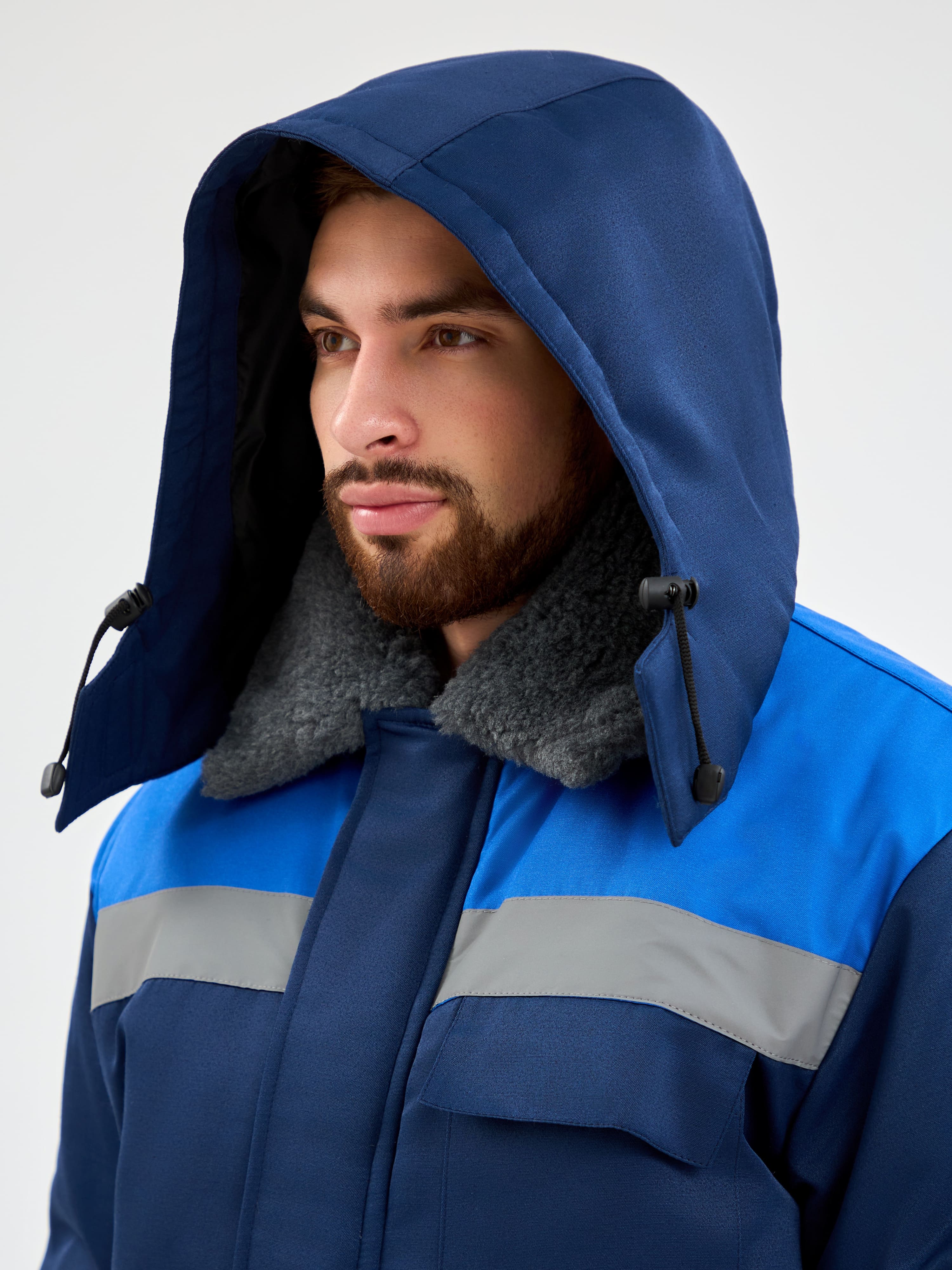 В комплект входят брюки на бретельках и удлинённая куртка с утяжками. Костюм подходит для использования на стройке, в автомастерских и на производствах в зимнее время. На груди, спине и в нижней части брюк имеются вставки из светоотражающего материала, повышающие заметность работника ночью. Воротник с отворотом, отделан мехом. При необходимости его можно поднимать для защиты шеи от ветра. Имеется капюшон с утяжками и застёжкой. На куртке предусмотрены нагрудный накладной карман под рацию и два больших кармана в нижней части. В области талии имеется утяжка. Куртка застёгивается на пуговицы.