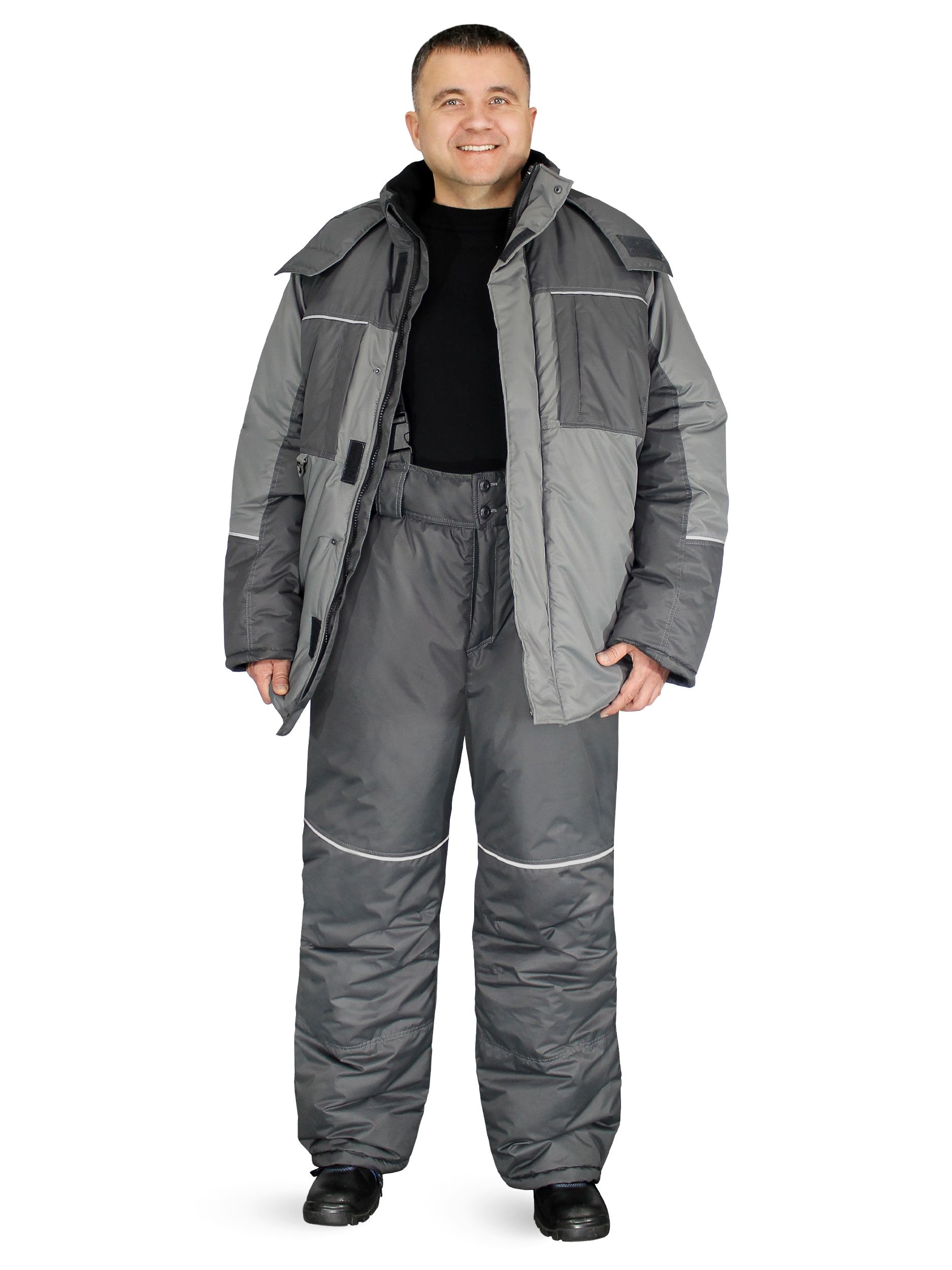 Комплект состоит из тёплой куртки и полукомбинезона. Костюм рассчитан на эксплуатацию в морозы на открытом воздухе и в неотапливаемых помещениях. Ткань устойчива к механическим воздействиям. Куртка отличается удлинённым кроем, хорошо защищает поясницу от продувания. Застёгивается на молнию с удобным большим язычком. Центральная застёжка защищена накладным ветрозащитным клапаном. В верхней части расположены косые врезные карманы. В нижней – вместительные накладные с клапаном на кнопках. Полукомбинезон оснащён эластичной вставкой в талии. Лямки регулируются пряжками по длине.