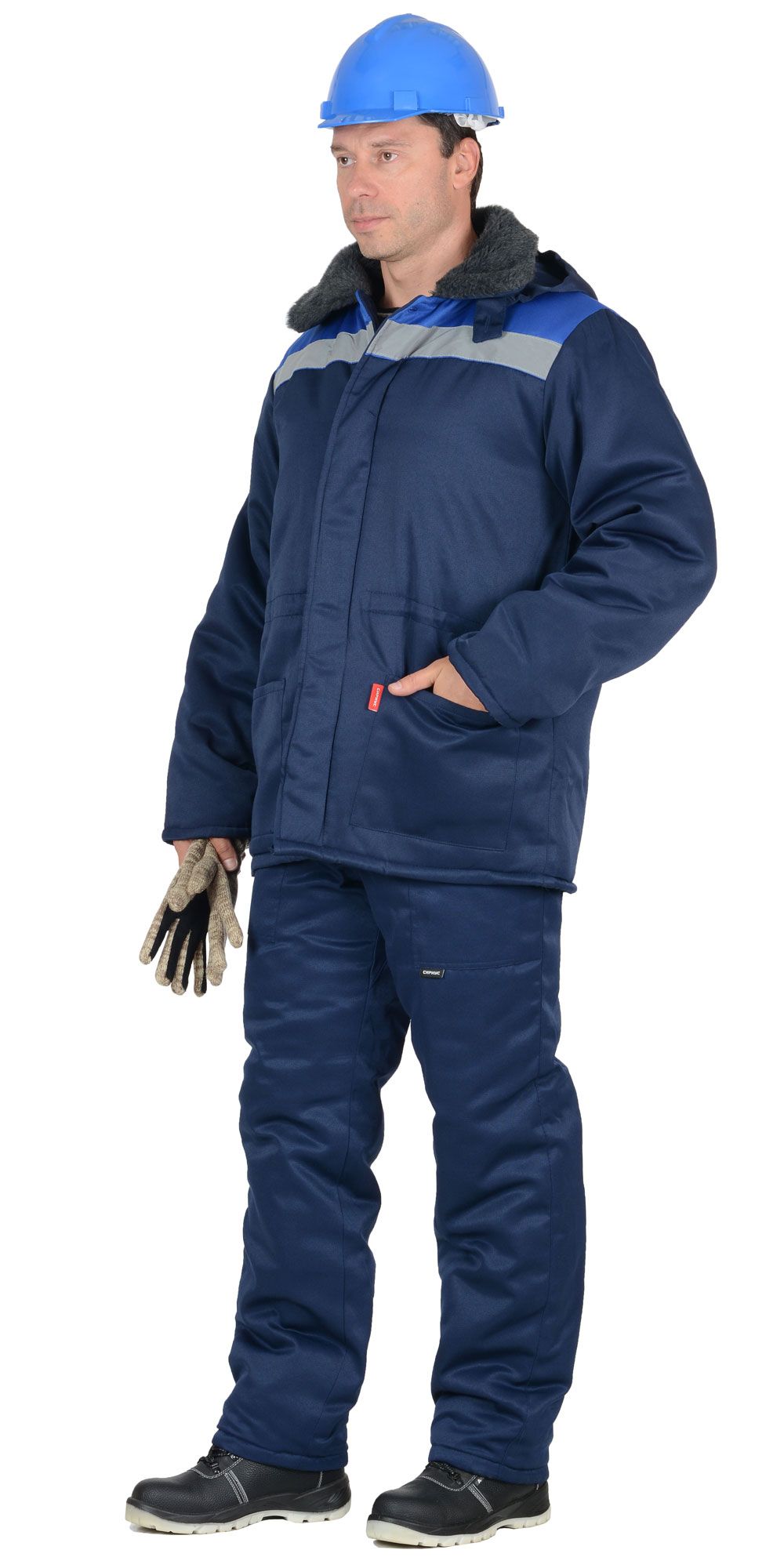 Костюм для работы в зимнее время на открытом воздухе. Ткань с водоотталкивающими свойствами. Куртка короткая с эластичной вставкой в нижней части. Манжеты тоже эластичные в форме напульсников, благодаря чему куртка не продувается через рукава и внутрь не попадает снег во время активной работы. Основная застёжка – молния. Дополнительно куртка запахивается на застёжки-липучки. Капюшон съёмный, регулируется по объёму. Воротник-стойка. На груди имеются накладные прямые карманы с клапанами, застёгивающимися на липучки. По бокам – косые открытые карманы. Полукомбинезон на эластичных бретелях с регулировкой по длине. Центральная застёжка – молния.