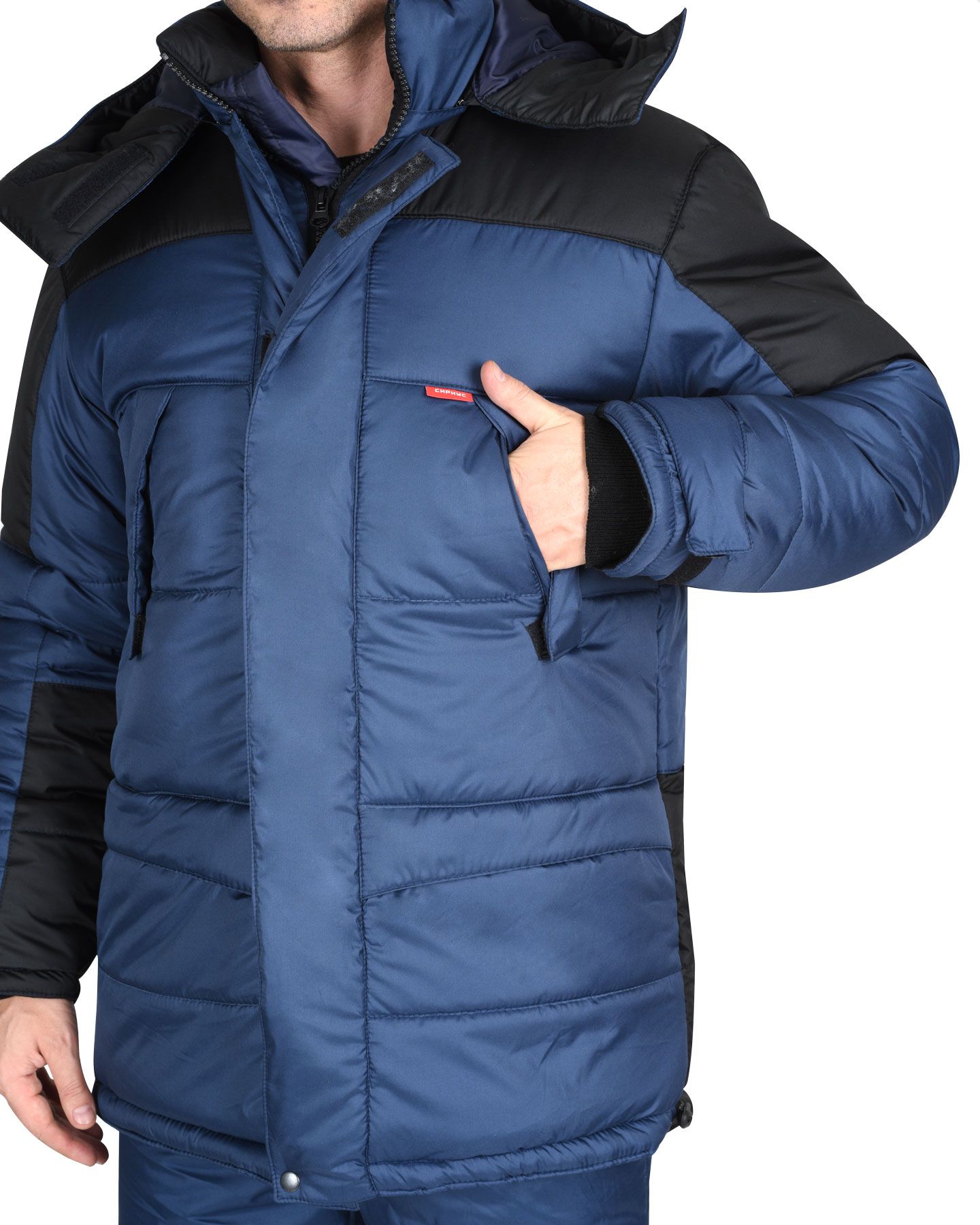 Костюм для работы в зимнее время на открытом воздухе. Ткань с водоотталкивающими свойствами. Куртка короткая с эластичной вставкой в нижней части. Манжеты тоже эластичные в форме напульсников, благодаря чему куртка не продувается через рукава и внутрь не попадает снег во время активной работы. Основная застёжка – молния. Дополнительно куртка запахивается на застёжки-липучки. Капюшон съёмный, регулируется по объёму. Воротник-стойка. На груди имеются накладные прямые карманы с клапанами, застёгивающимися на липучки. По бокам – косые открытые карманы. Полукомбинезон на эластичных бретелях с регулировкой по длине. Центральная застёжка – молния.
