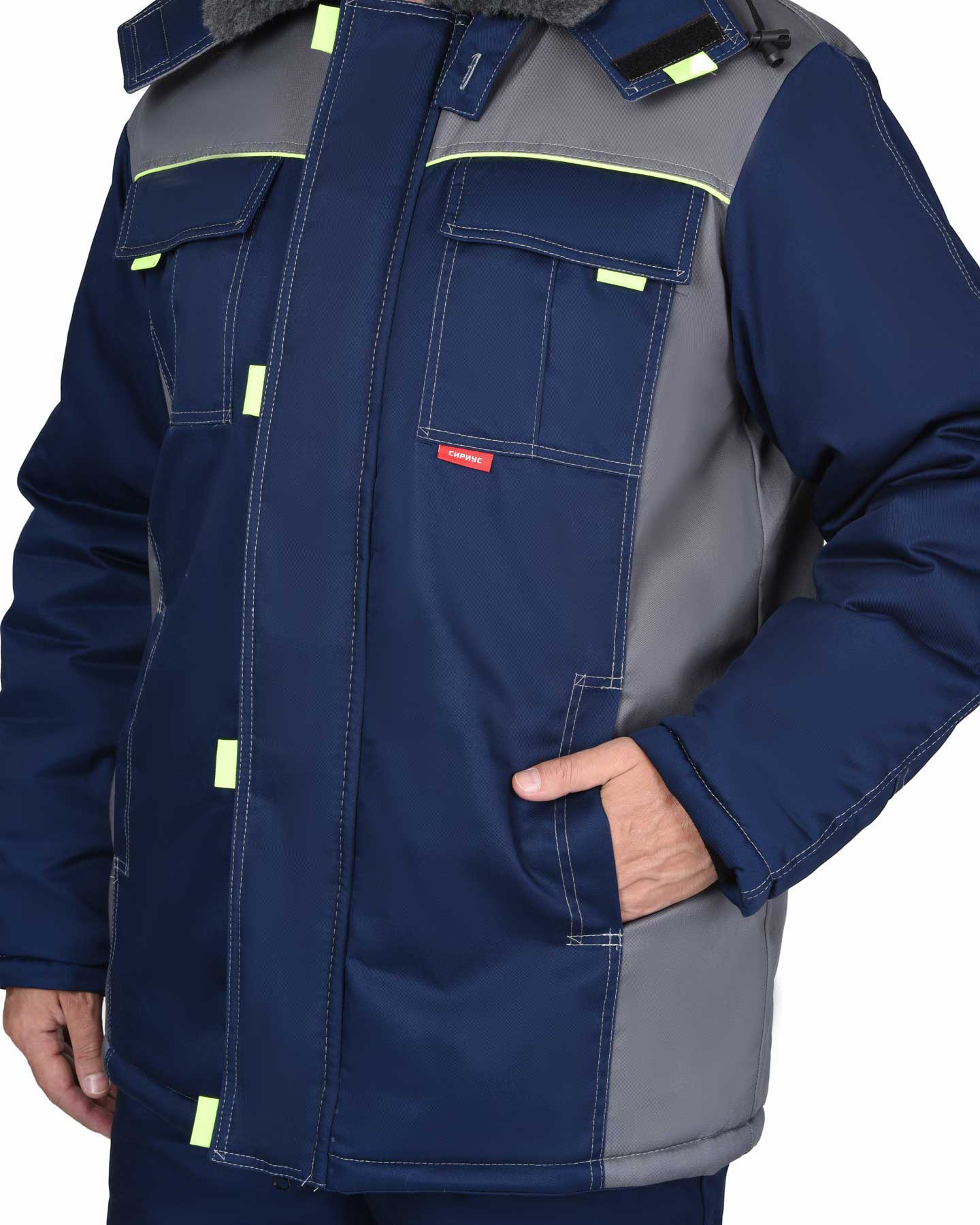Ткань: смесовая, 65% ПЭ, 35% ХБ, плотность 215 г/кв.м, световозвращающий материал 50 мм, утеплитель синтепон 150 гр/м.кв