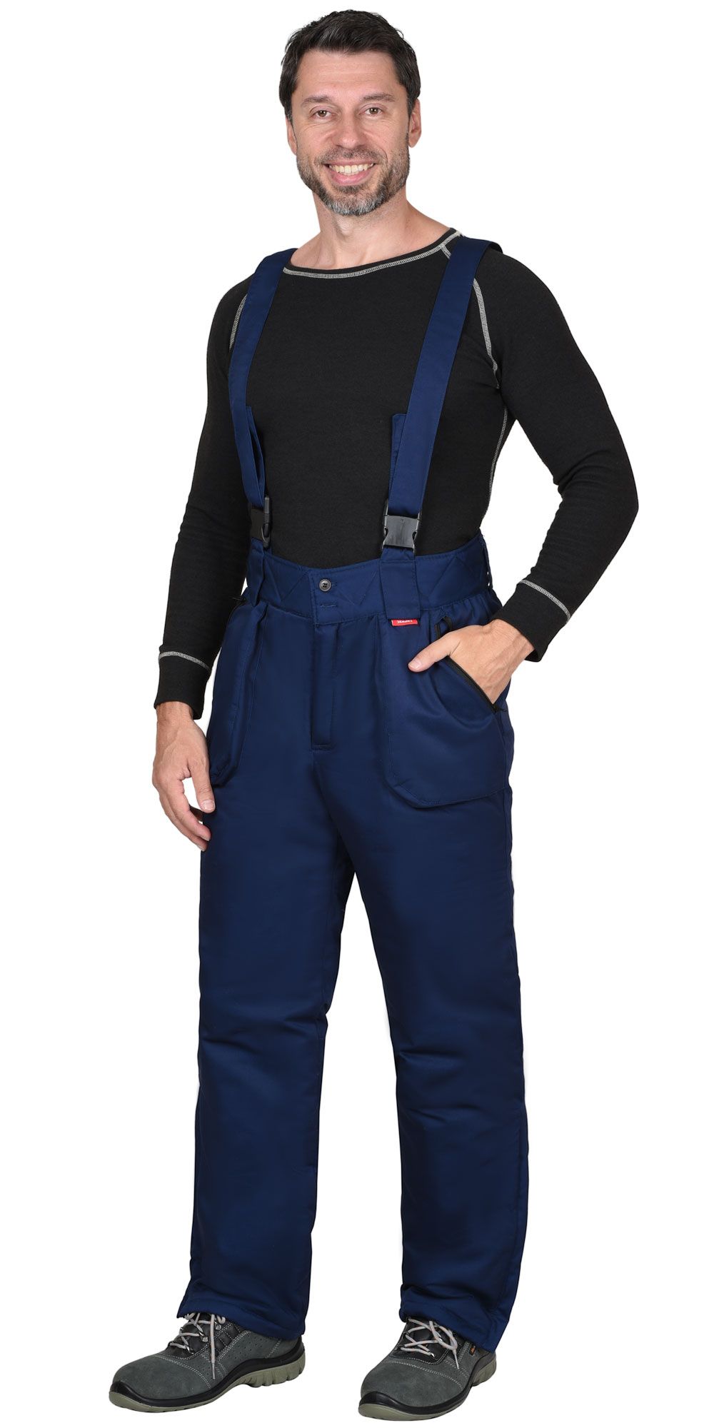 Брюки прямые на утеплённой подкладке, с застежкой спереди на гульфик с молнией. Брюки с фигурным широким поясом с застежкой на 2 пуговицы, с боковыми накладными карманами с молнией, со съёмными бретелями. По боковым швам внизу разрез с молнией. Бретели пристегиваются к брюкам при помощи пуговиц и петель, регулируются по длине защелками-фастексами.