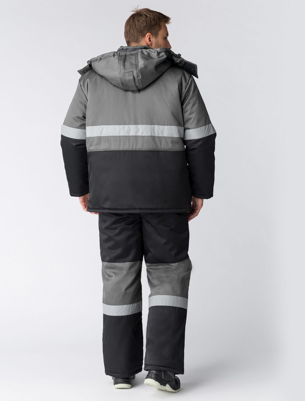 В комплект входят брюки на бретельках и удлинённая куртка с утяжками. Костюм подходит для использования на стройке, в автомастерских и на производствах в зимнее время. На груди, спине и в нижней части брюк имеются вставки из светоотражающего материала, повышающие заметность работника ночью. Воротник с отворотом, отделан мехом. При необходимости его можно поднимать для защиты шеи от ветра. Имеется капюшон с утяжками и застёжкой. На куртке предусмотрены нагрудный накладной карман под рацию и два больших кармана в нижней части. В области талии имеется утяжка. Куртка застёгивается на пуговицы.