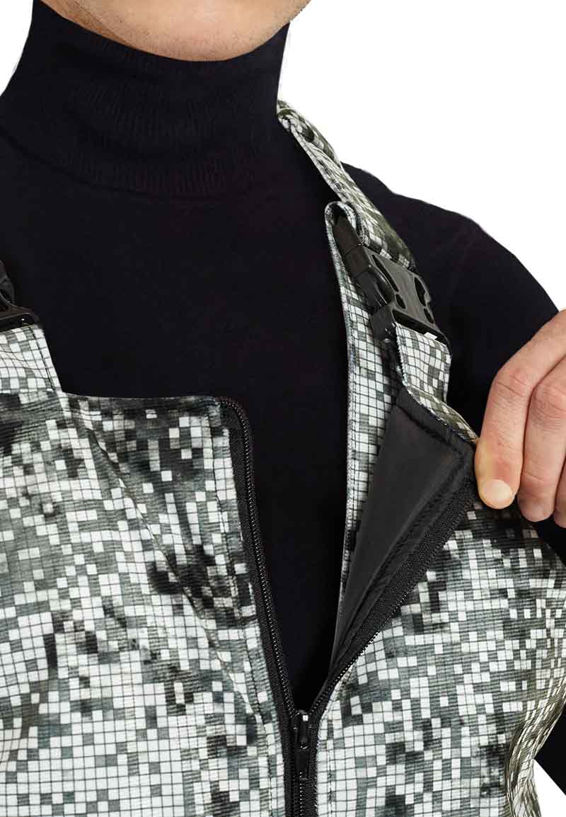 В комплект входят длинная куртка и полукомбинезон на лямках. Куртка застёгивается на двойную молнию. Центральная застёжка дополнительно защищена клапаном от продувания. Клапан фиксируется на липучку под горлом и в нижней части застёжки. В рукава вставлены дополнительные внутренние манжеты из эластичного трикотажного материала. Манжеты предотвращают засыпание в рукав снега и мусора. Полукомбинезон имеет глубокую посадку, защищает от холода грудь и спину. Лямки регулируются по длине. На комбинезоне расположено множество карманов под инструменты. Костюм имеет вставки из светоотражающего материала на груди.