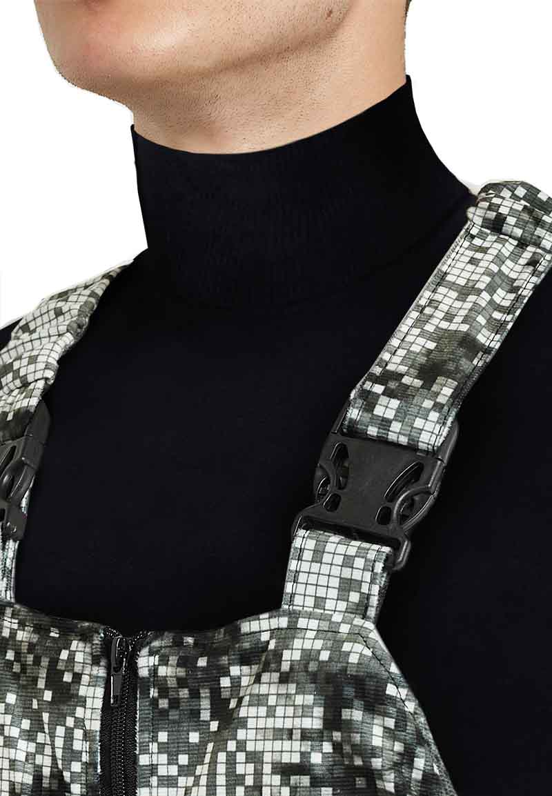 Полукомбинезон прямой, утепленный, стеганный, с притачной утеплённой подкладкой, с цельнокроеной грудкой и спинкой, с центральной застёжкой на 2-х замковую тесьму - "молнию" и ветрозащитным клапаном, с регулируемыми бретелями.