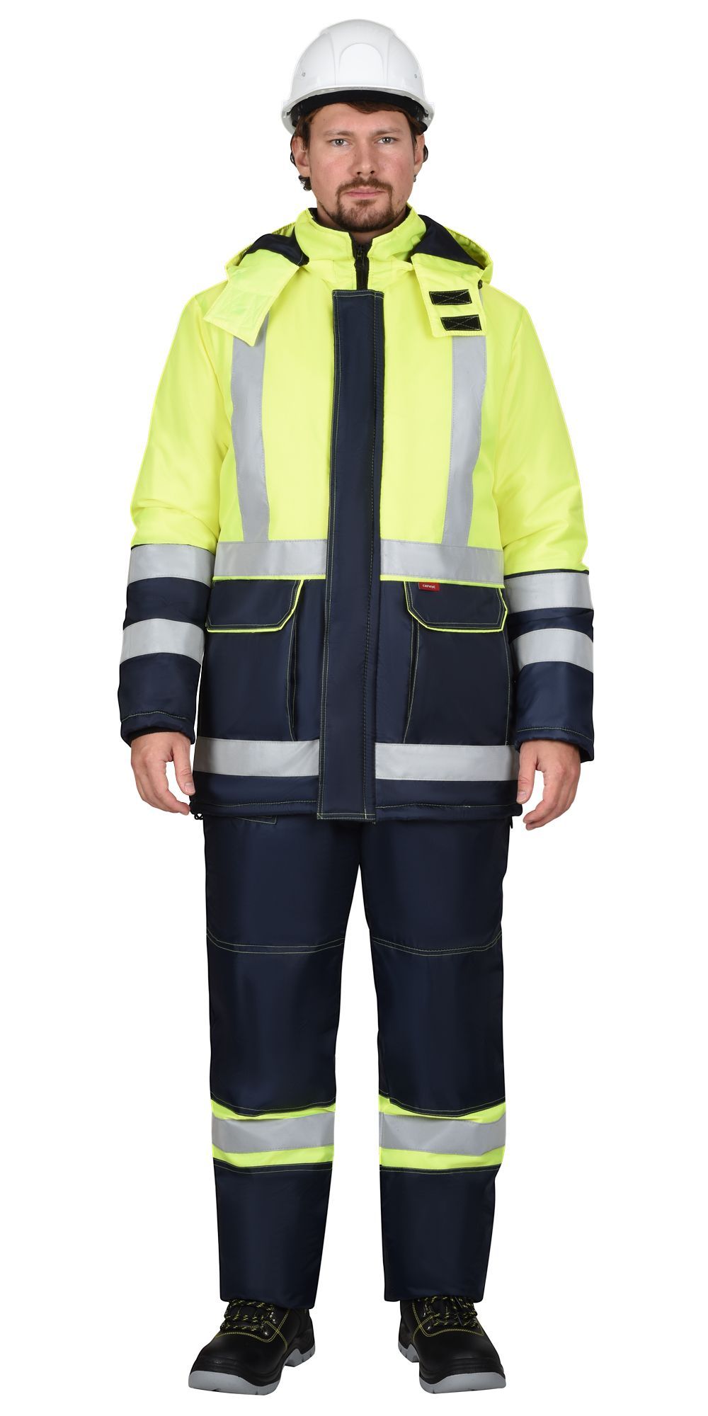 Ткань: смесовая, 65% ПЭ, 35% ХБ, плотность 215 г/кв.м, световозвращающий материал 50 мм, утеплитель синтепон 150 гр/м.кв