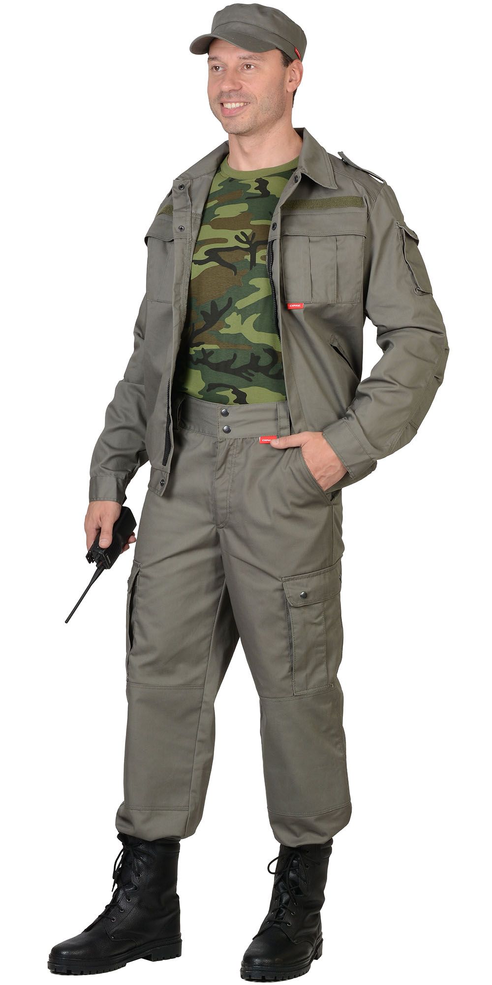Куртка длинная прямого силуэта; с центральной заст.жкой на пять петель и пуговиц; с верхним накладным карманом с клапаном и нижними накладными карманами. Рукава с налокотниками и манжетами на пуговицах.Брюки с притачным поясом, заст.гивающимся на 1 петлю и пуговицу; с 5-ю шлевками; с заст.жкой гульфика на 3 петли и пуговицы; с двумя накладными боковыми карманами с наклонным входом; усилительными накладками в области колен; с талиевыми вытачками на задних половинках.