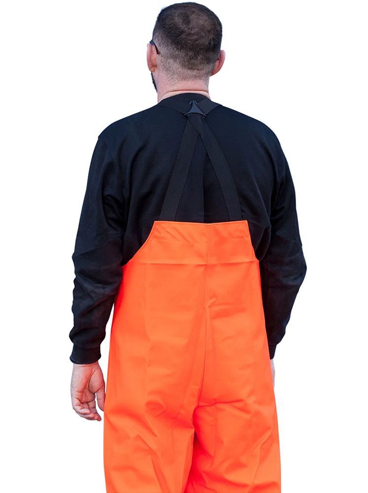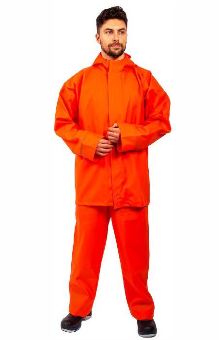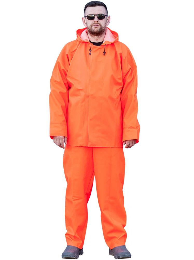 Изготовлен из ПВХ ткани, толщиной 0.7мм.Куртка на молнии и липах. П/комбинезон, регулируемый по ширине с карманом. Швы герметизируются током ВЧ. Особо прочный, долговечный. Цвет ярко-оранжевый. Возможно изготовление с СОП, при этом цена увеличится.