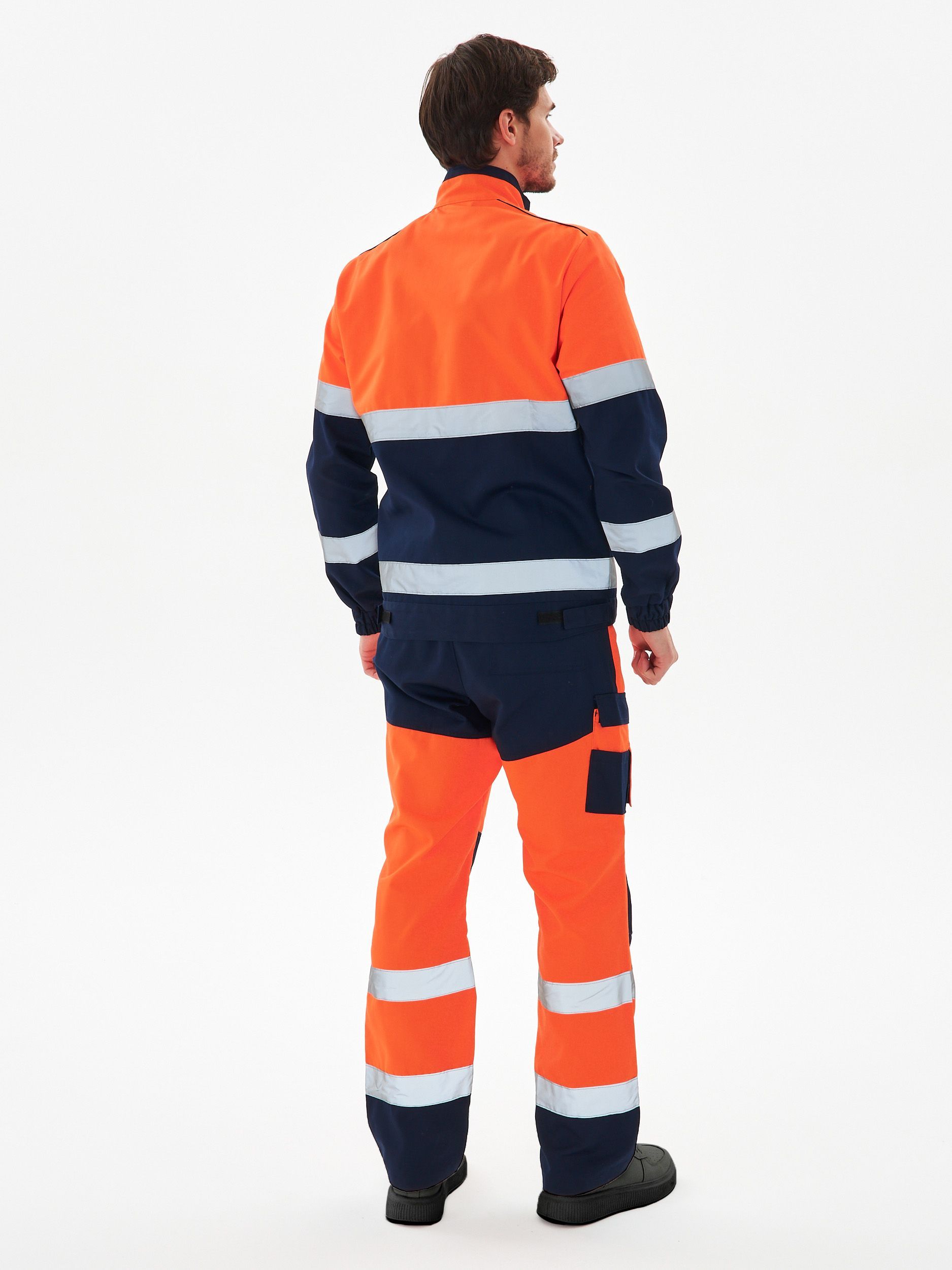 Мужской костюм: полукомбинезон и куртка. Чёрной отделкой дополнены отложной воротник, рукава, карманы на брюках, низ куртки и брючин. Красная отделка используется для кокетки (перед, спинка), клапанов. Светоотражающая полоса – на кокетке, полочках, рукавах и брючинах. Застёгивается на молнию по центру, дополнительно имеется контактная лента. Низ – на кнопке, эластичен по бокам. Вертикальные складки спинки. Имеются карманы: пара нагрудных (из них один с клапаном), пара боковых. Полукомбинезон: на бретелях и в талии – резинка, регулировка лямок карабинами. Карманы: на грудке – многофункциональный, боковые – накладные (с усилением), дополнительный под инструмент. Брючины оснащены усилительными накладками.