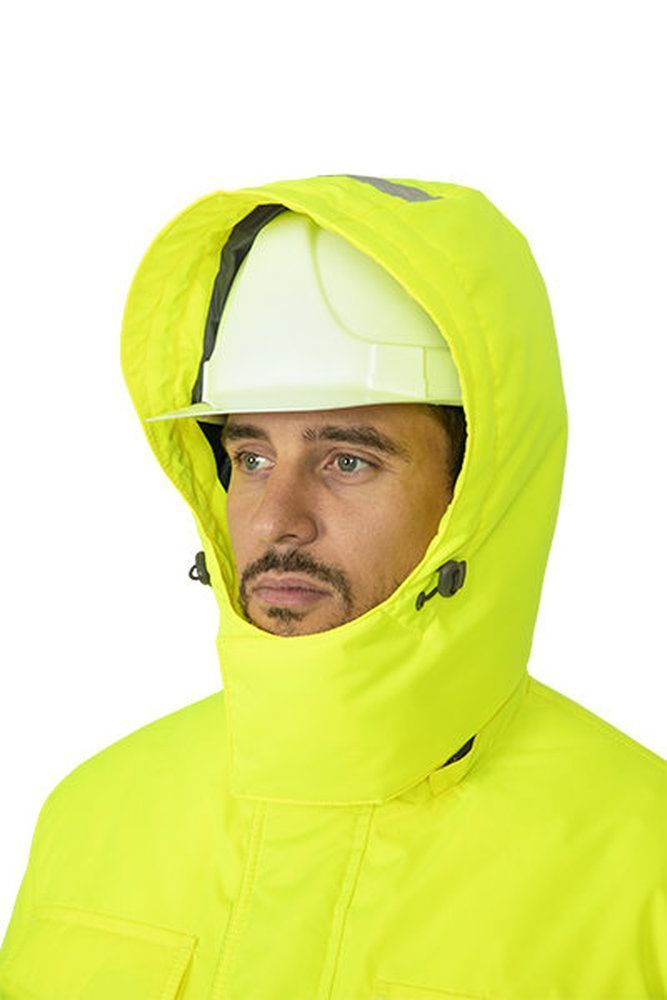 • капюшон утепленный с подбородочной частью, пристегивается на тесьму-молнию, с регулировкой по ширине и высоте