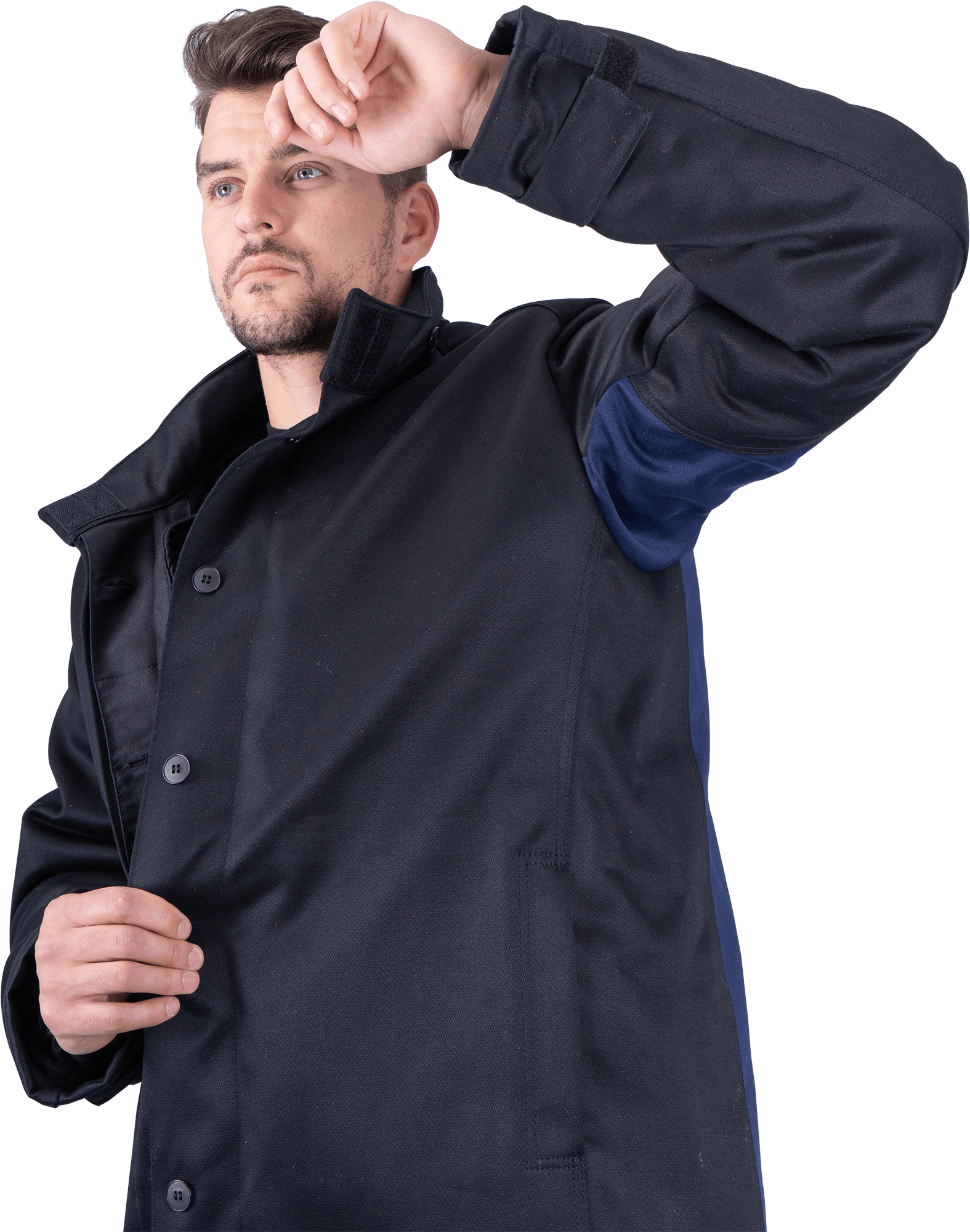 Зимний костюм сварщика имеет надежное утепление, благодаря которому возможно выполнение работ даже при отрицательных температурах. Застежка на куртке имеет клапан, защищающий работника от ветра. Карманы скрыты в боковых швах.