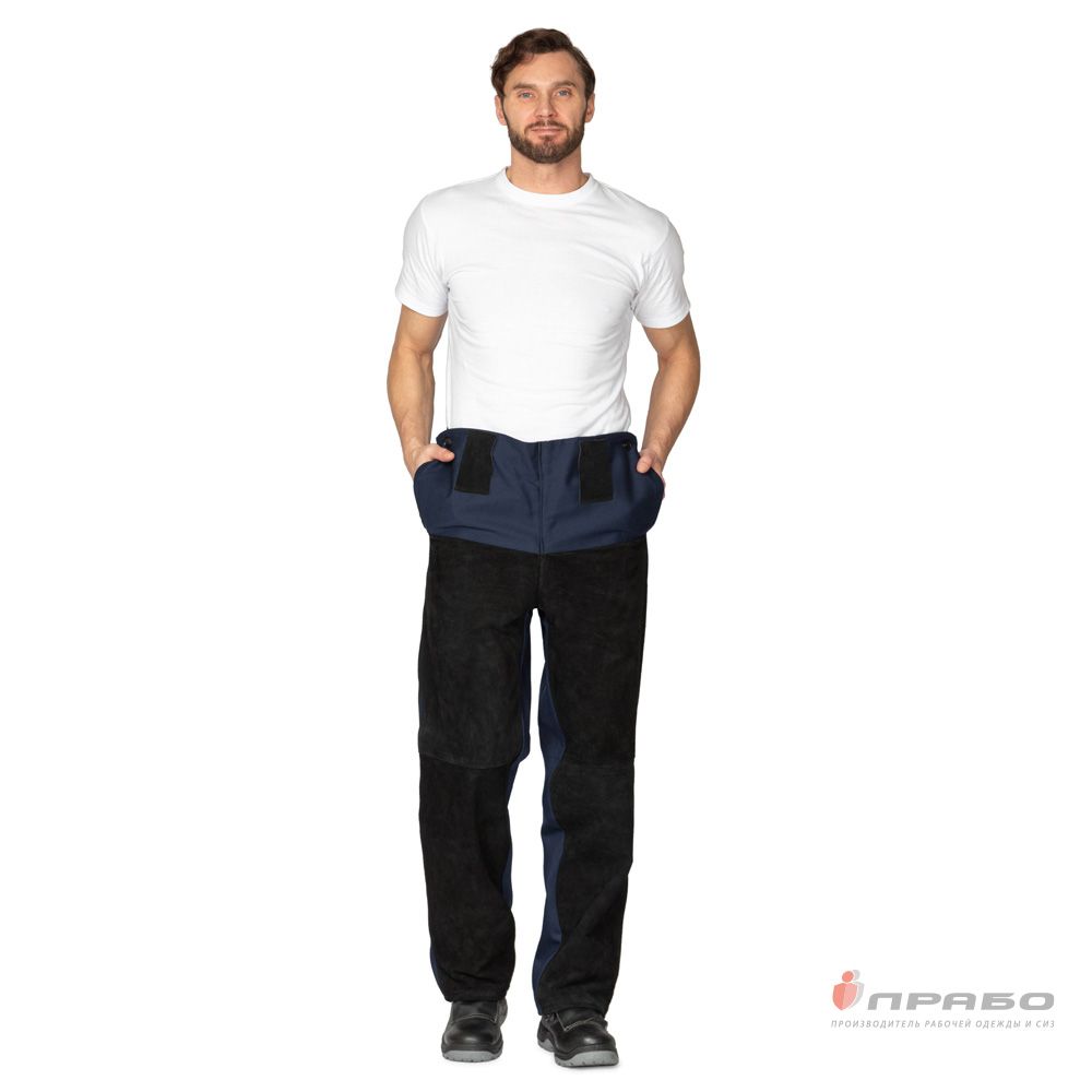 Брюки: свободного прямого кроя, застёжкой в боковых швах на термостойкие пуговицы (аминопласт), с откидывающейся передней частью — лацбантом. Лацбант пристёгивается к поясу на пуговицы в боковых швах. На поясе шлёвки для удобства носки с ремнём. Передняя часть брюк выполнена из кожевенного спилка чёрного цвета. В паховой области пробиты вентиляционные отверстия для улучшения воздухообмена.