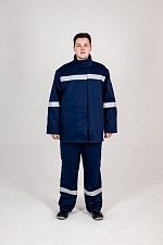 Утепленные костюмы позволяют выполнять сварочные работы при минусовых температурах. Благодаря огнеупорным свойствам кожевенного спила модель служит надежной защитой от искр и брызг расплавленного металла. В качестве теплоизоляционного материала используется ватин. Подкладка у модели бязевая, отложной воротничок подшит хлопчатобумажной тканью. Куртка застегивается на пуговицы, застежка защищена дополнительным клапаном. Карманы у модели накладные, расположены по бокам.