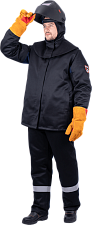 Зимний костюм сварщика имеет надежное утепление, благодаря которому возможно выполнение работ даже при отрицательных температурах. Застежка на куртке имеет клапан, защищающий работника от ветра. Карманы скрыты в боковых швах.