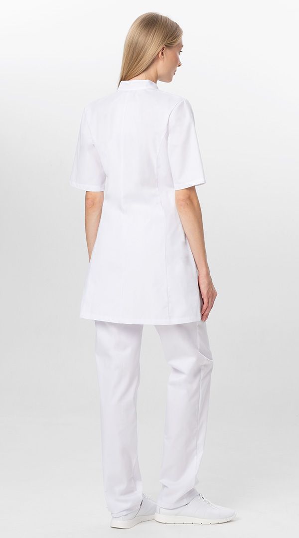 Женский рабочий халат. Силуэт приталенный. Без пояса. Отделка контрастного цвета – на кокетке и внутренней части центральной планки. На кокетке по нижнему срезу – светоотражающий кант. Воротник отложной. Центральная застёжка сквозная, пуговичная. Рукава оснащены манжетой с пуговичной застёжкой. Есть две пары карманов накладного типа: на груди (один с отстроченным отделением для мобильного телефона и клапаном), большие боковые.