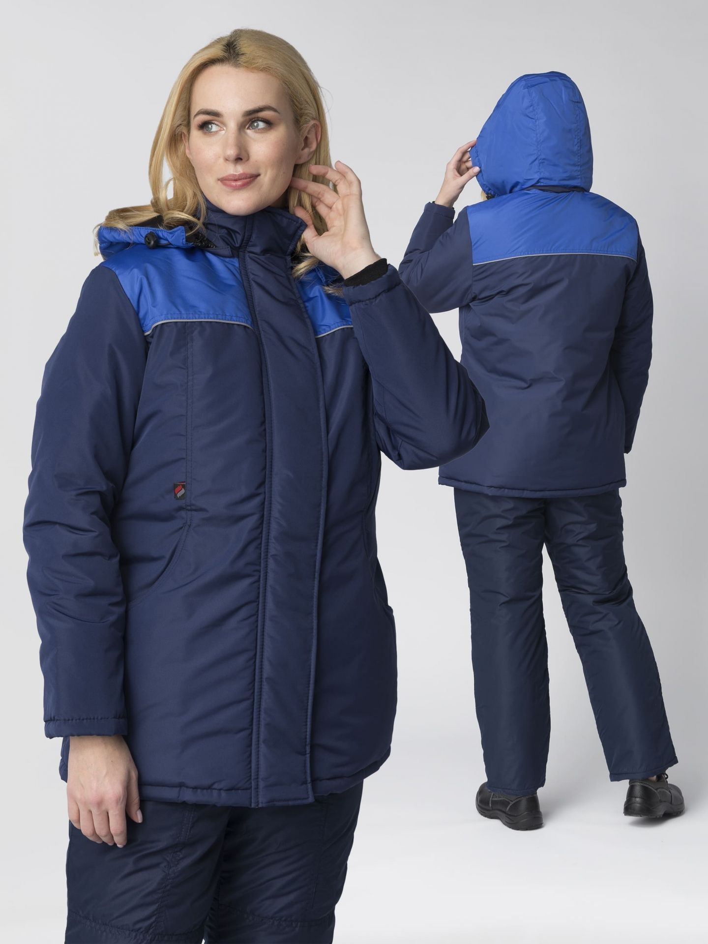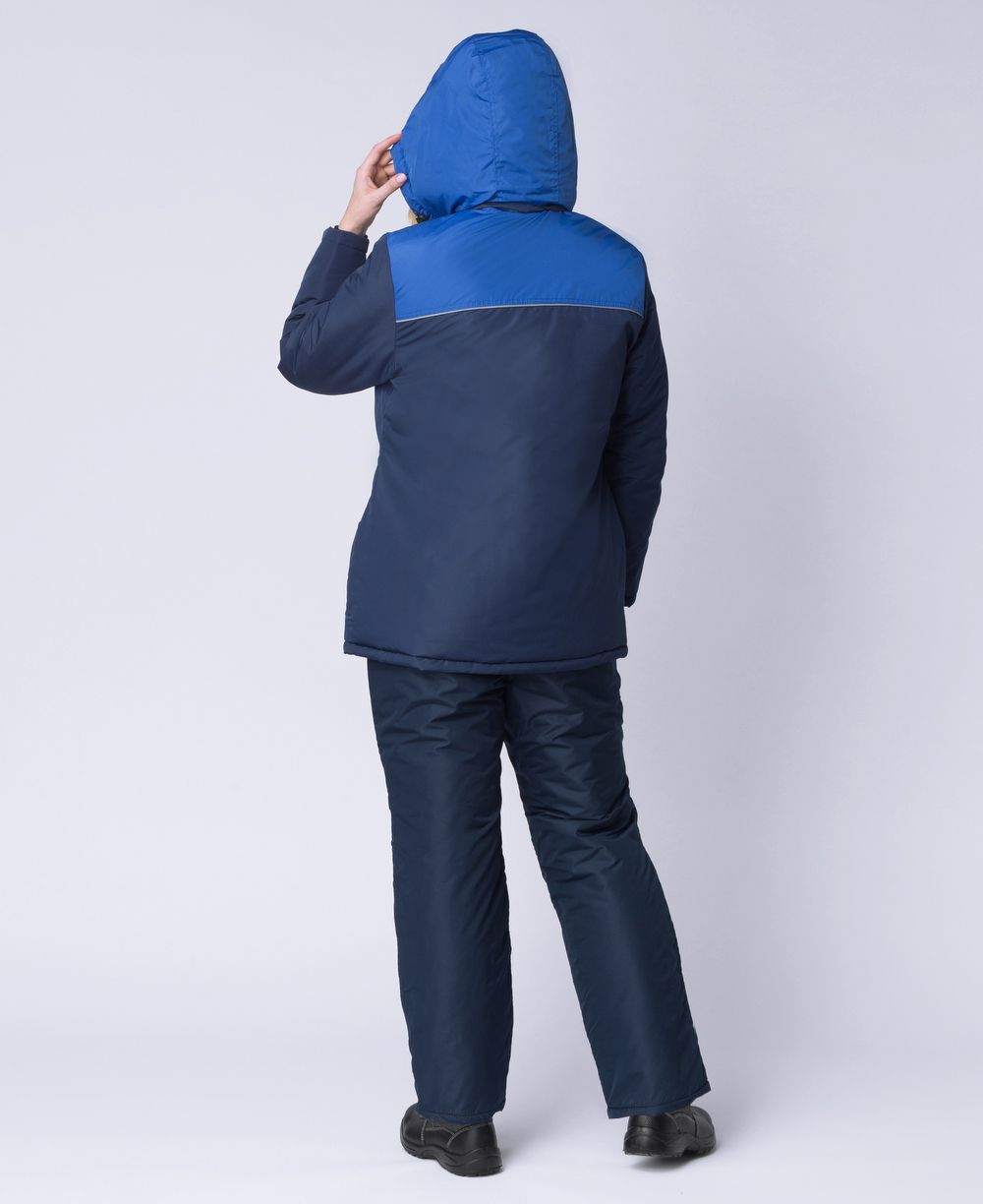В комплект входят брюки на бретельках и удлинённая куртка с утяжками. Костюм подходит для использования на стройке, в автомастерских и на производствах в зимнее время. На груди, спине и в нижней части брюк имеются вставки из светоотражающего материала, повышающие заметность работника ночью. Воротник с отворотом, отделан мехом. При необходимости его можно поднимать для защиты шеи от ветра. Имеется капюшон с утяжками и застёжкой. На куртке предусмотрены нагрудный накладной карман под рацию и два больших кармана в нижней части. В области талии имеется утяжка. Куртка застёгивается на пуговицы.