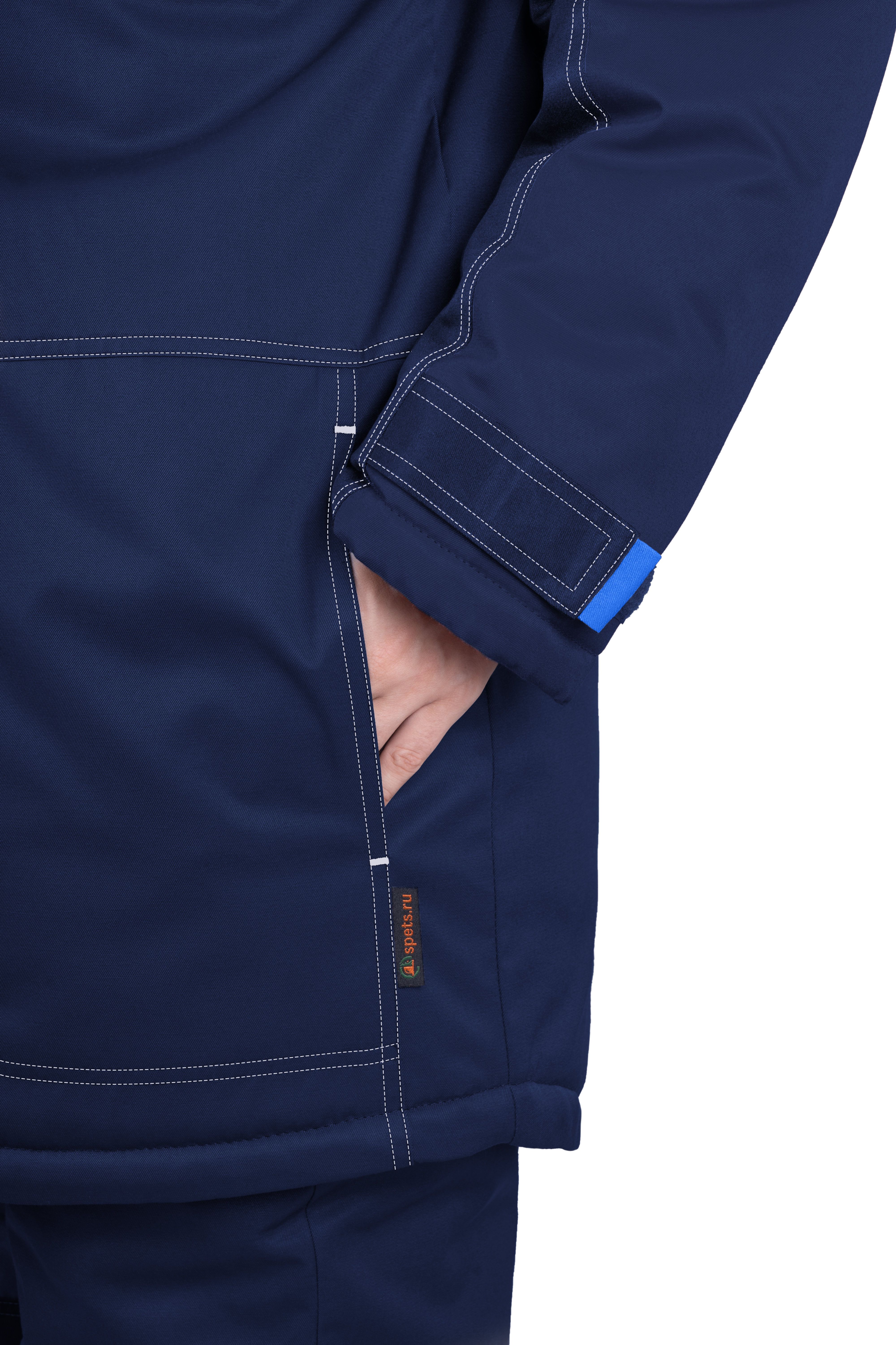 В комплект входят длинная тёплая куртка и полукомбинезон с цельнокроеной спинкой и лифом. Покрой полукомбинезона и куртки – прямой. На куртке в области талии имеется кулиса для регулировки ширины. Куртка укомплектована капюшоном на кнопках. Воротник-стойка для защиты шеи от ветра застёгивается под горлом. В куртке используется центральная застёжка-молния, спрятанная под накладной клапан, застёгивающийся на липучки. В рукава вставлены эластичные манжеты. На груди прорезные карманы, по бокам в нижней части – накладные с клапанами на липучках. Капюшон фиксируется на куртке с помощью кнопок. Полукомбинезон с эластичными лямками, регулируемыми по длине. На лямках имеются застёжки в виде трезубцев.