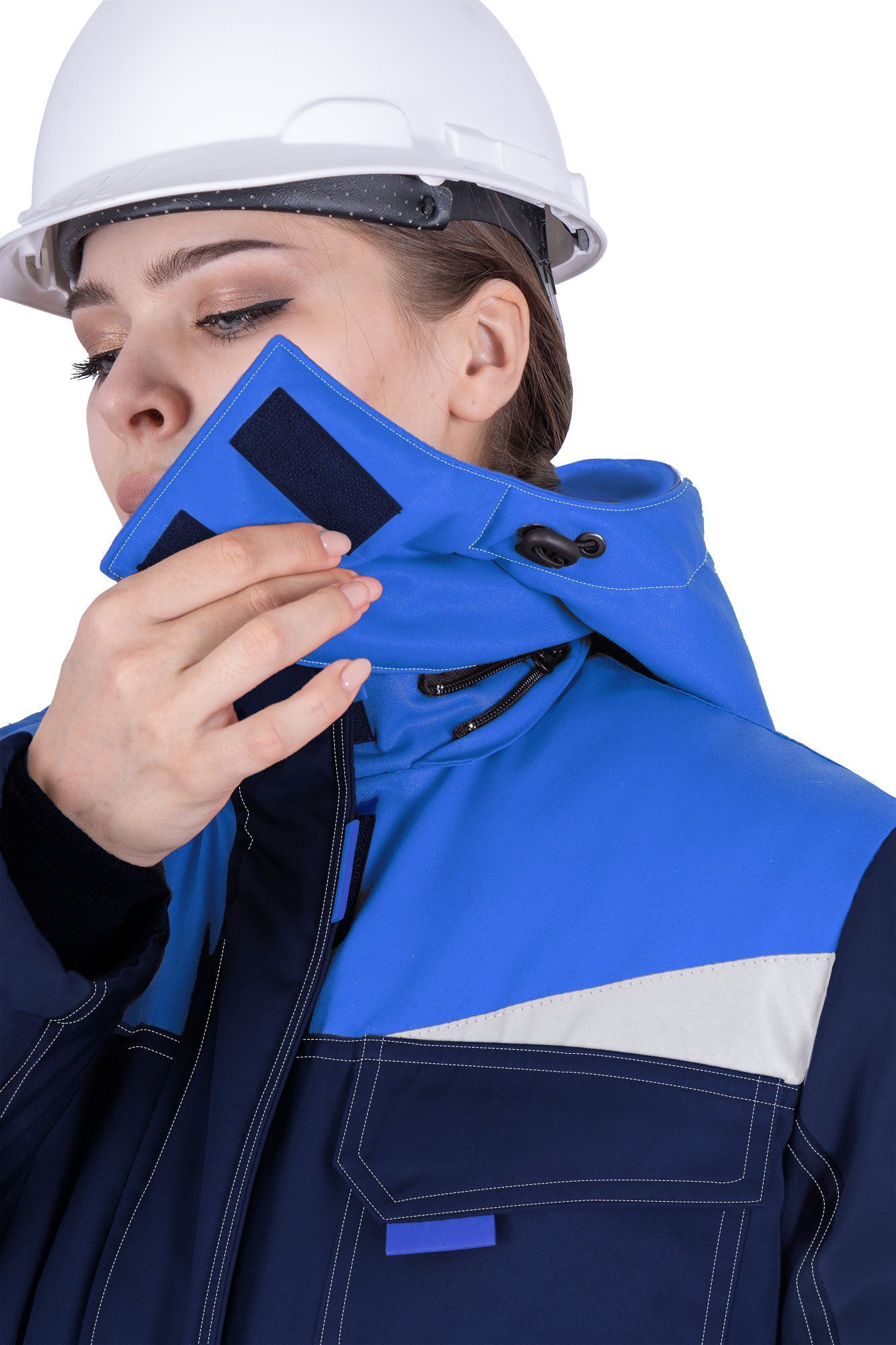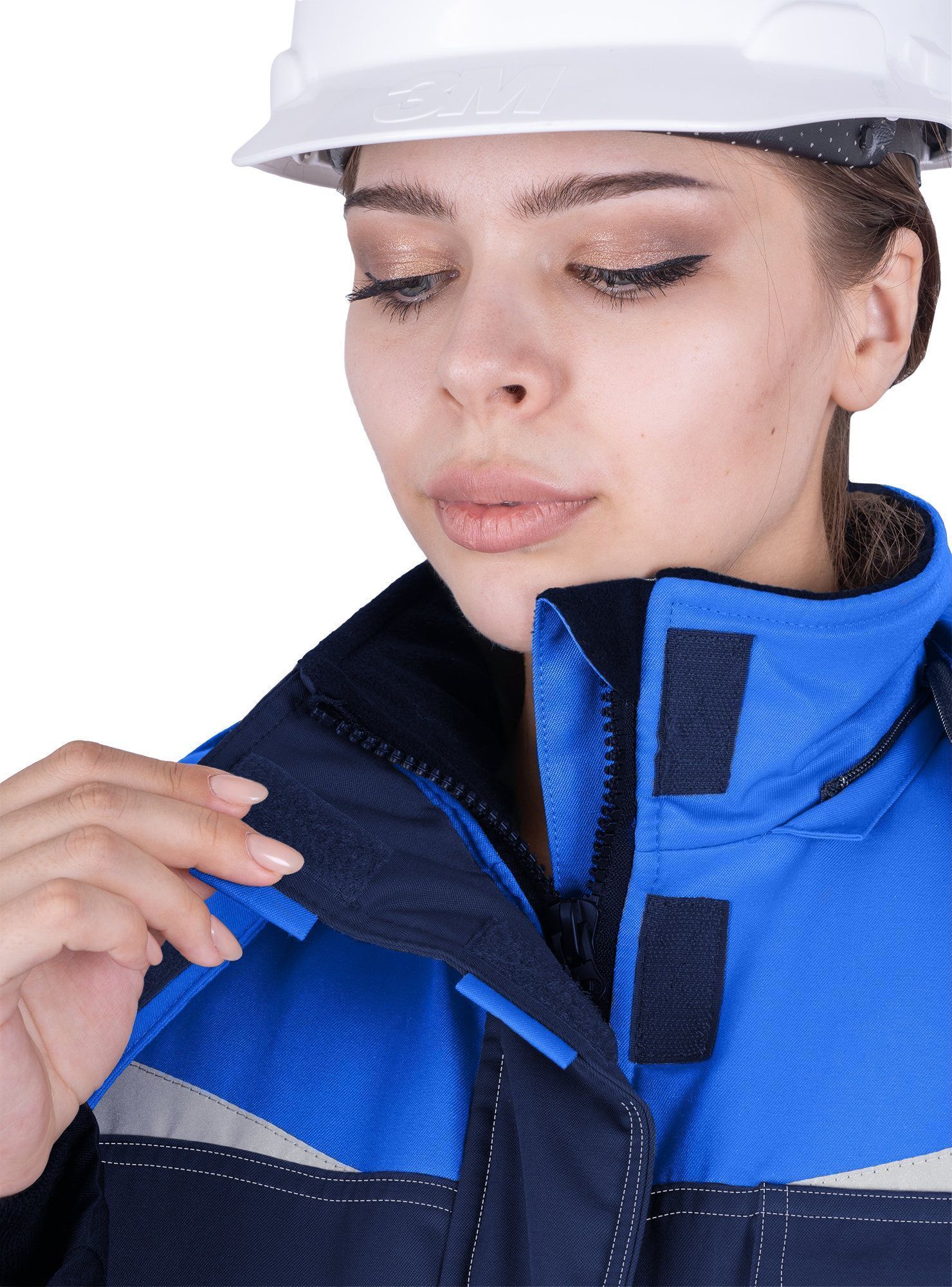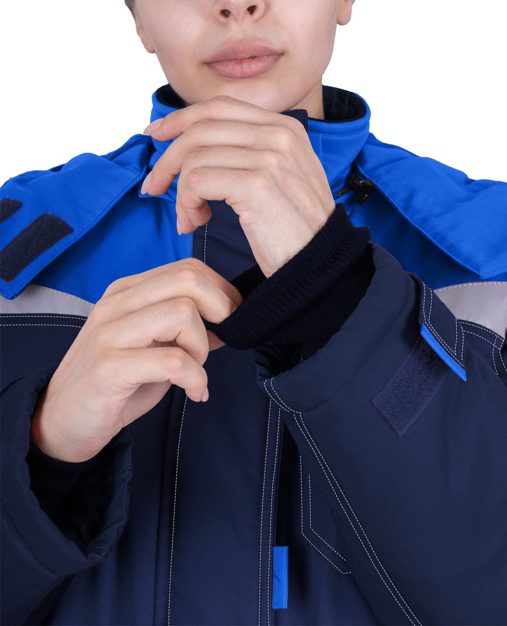 Зимний женский рабочий костюм "Снежана" включает длинную куртку с утягивающей кокеткой в области талии и приталенный полукомбинезон, закрывающий грудь и спину. Куртка застёгивается на надёжную молнию из пластика. Застёжка располагается за накладным клапаном, предотвращающим продувание и защищающим от попадания внутрь воды. Для увеличения заметности работницы – по груди проходит светоотражающий кант. Воротник высокий, флисовый. Капюшон отстёгивается. Полукомбинезон оснащён регулируемыми по длине эластичными лямками. В области талии вставлена эластичная тесьма для более плотного прилегания одежды к телу.