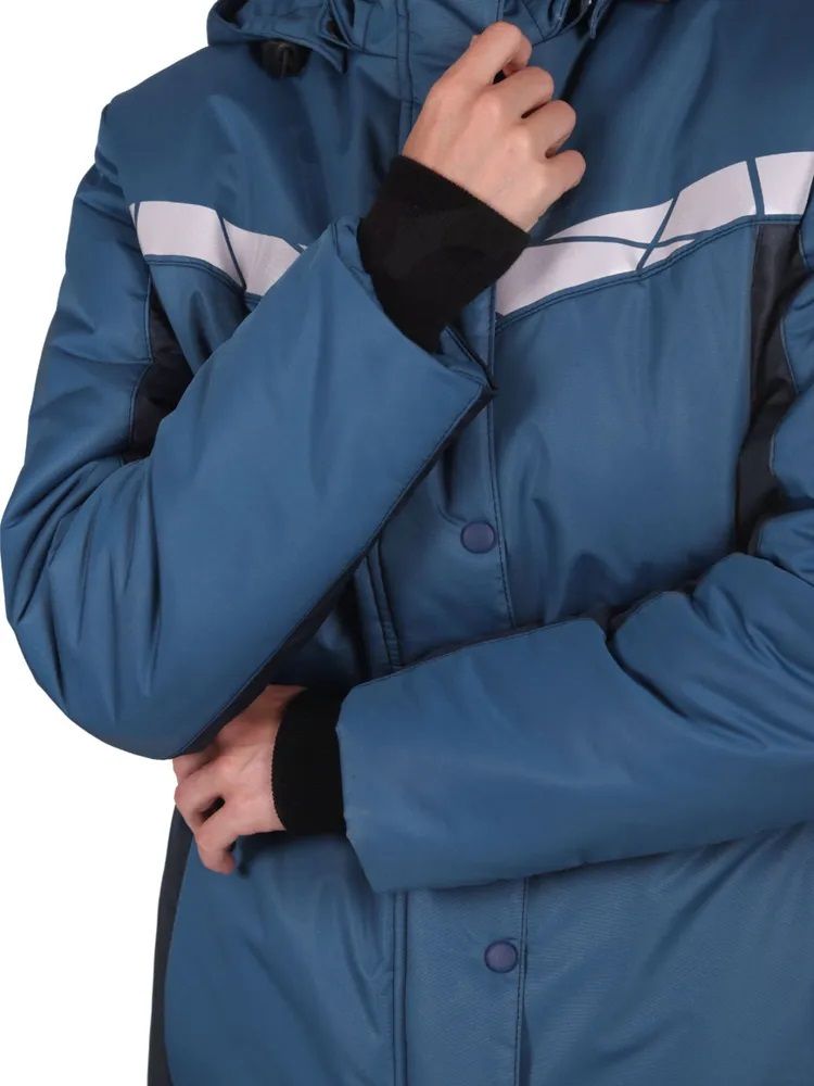 Зимний женский рабочий костюм "Снежана" включает длинную куртку с утягивающей кокеткой в области талии и приталенный полукомбинезон, закрывающий грудь и спину. Куртка застёгивается на надёжную молнию из пластика. Застёжка располагается за накладным клапаном, предотвращающим продувание и защищающим от попадания внутрь воды. Для увеличения заметности работницы – по груди проходит светоотражающий кант. Воротник высокий, флисовый. Капюшон отстёгивается. Полукомбинезон оснащён регулируемыми по длине эластичными лямками. В области талии вставлена эластичная тесьма для более плотного прилегания одежды к телу.