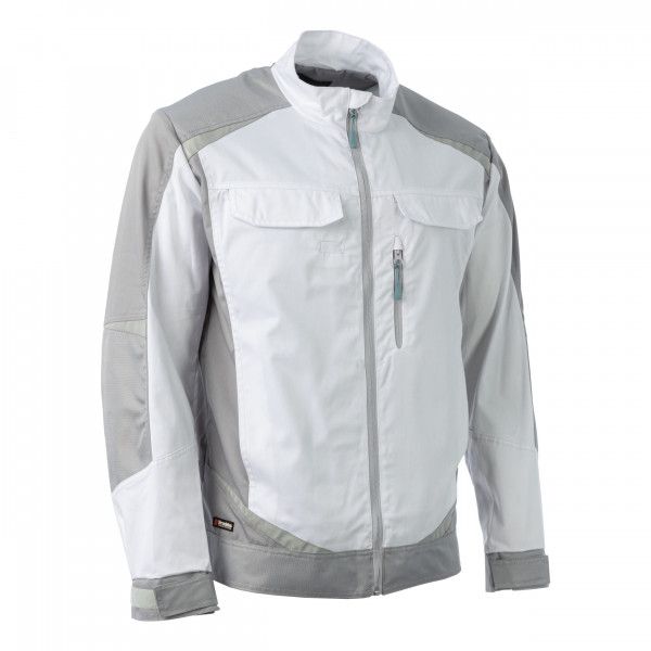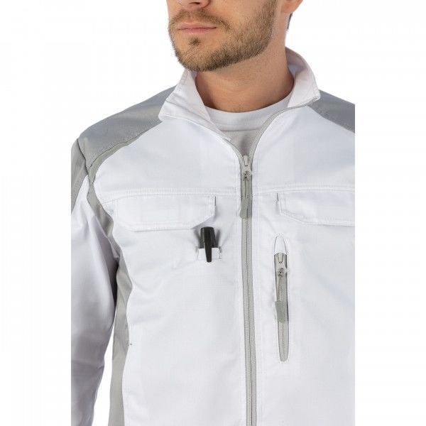 Куртка выполнена в эргономичном крое. В ней удобно работать и двигаться. Куртка в бело-сером исполнении является традиционной для маляров, гипрочников, специалистов по выполнению внутренних отделочных работ. На такой одежде меньше видны профессиональные загрязнения. А за счёт светлого тона в ней комфортно работать на улице под палящим солнцем.