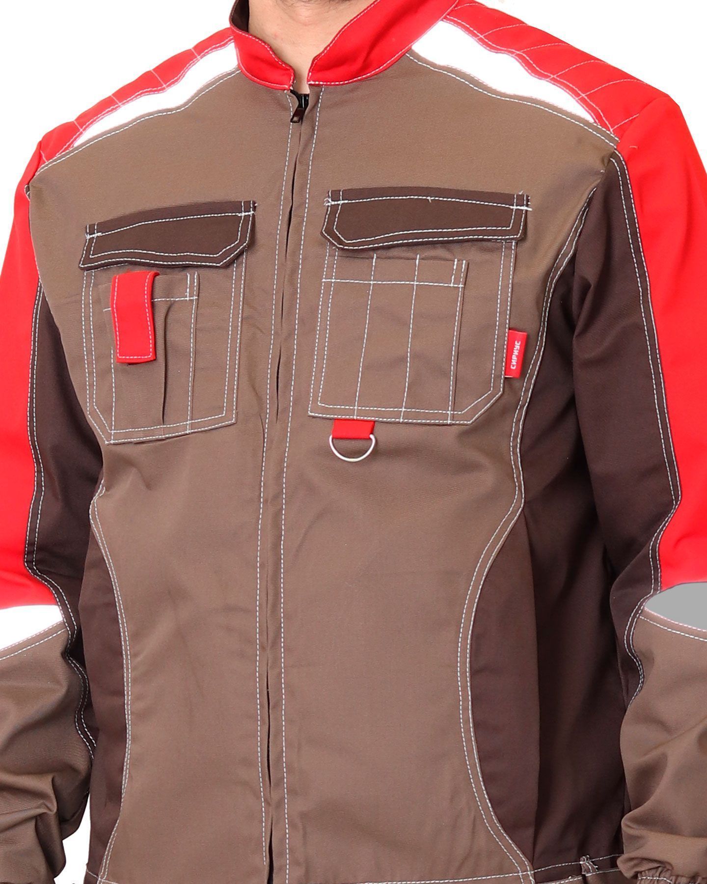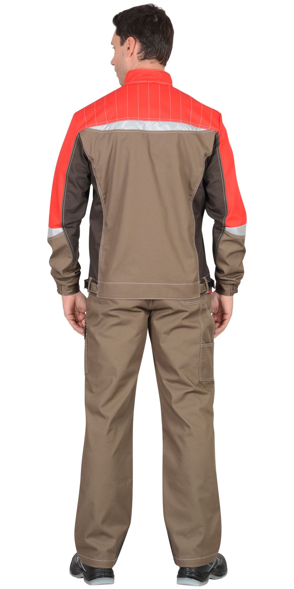 Мужской костюм с курткой и брюками. Двойная декоративная строчка. Отделка светло-серая на куртке – на кокетке переда. Нижний срез кокетки с красным кантом. Красные вставки на центральной планке, на нагрудном кармане и рядом с манжетами рукавов. Куртка короткая, застёжка-молния по центру, скрытая. На спинке вертикальные складки. Отложной воротник. Карманы: в вертикальных швах и накладные на груди (с клапанами). Брюки прямые, с застёжкой-молнией и на пуговице, пояс регулируется по бокам хлястиками на липучках. Имеются два боковых кармана (вход фигурный), два задних для инструмента.