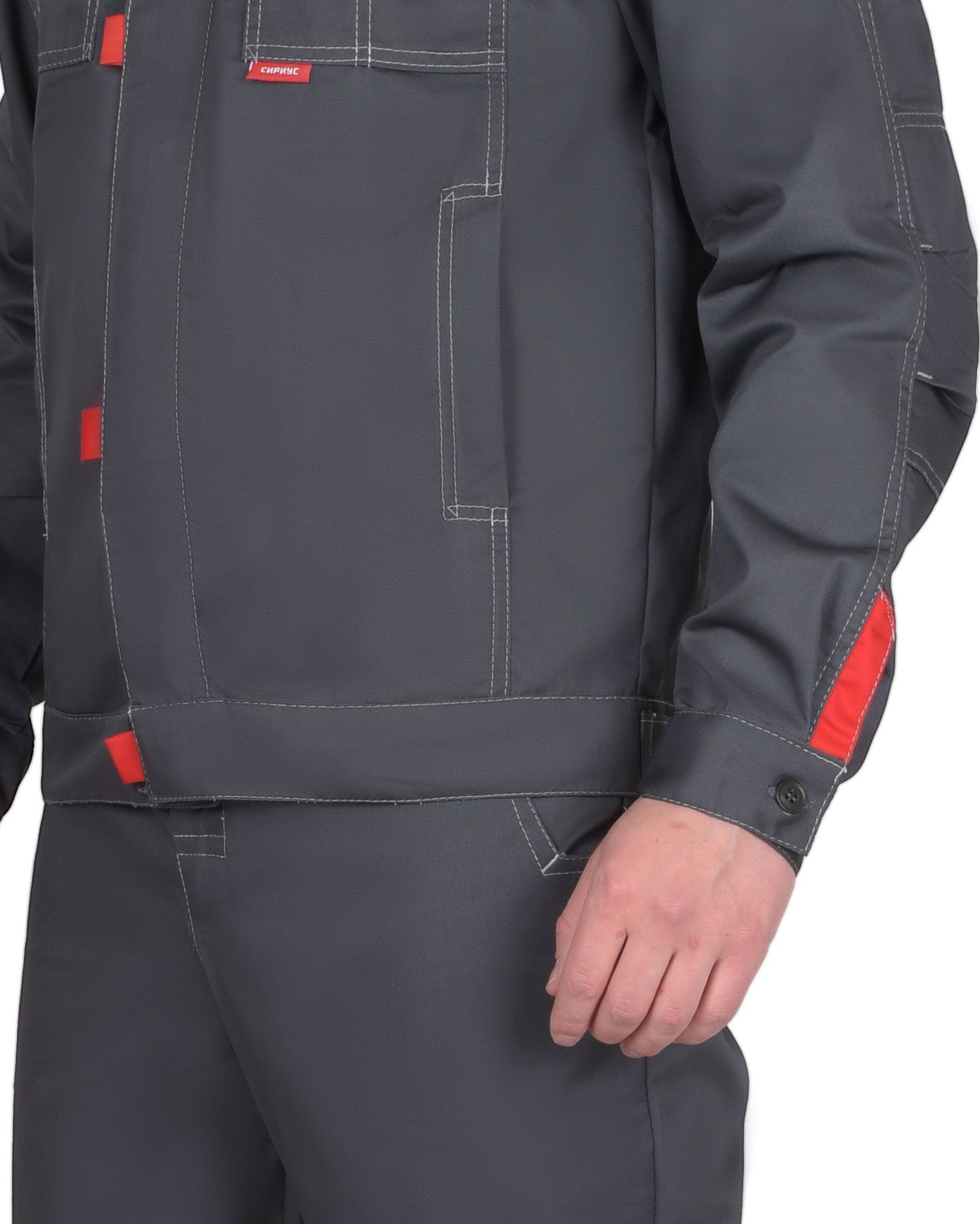 Мужской костюм с курткой и брюками. Двойная декоративная строчка. Отделка светло-серая на куртке – на кокетке переда. Нижний срез кокетки с красным кантом. Красные вставки на центральной планке, на нагрудном кармане и рядом с манжетами рукавов. Куртка короткая, застёжка-молния по центру, скрытая. На спинке вертикальные складки. Отложной воротник. Карманы: в вертикальных швах и накладные на груди (с клапанами). Брюки прямые, с застёжкой-молнией и на пуговице, пояс регулируется по бокам хлястиками на липучках. Имеются два боковых кармана (вход фигурный), два задних для инструмента.