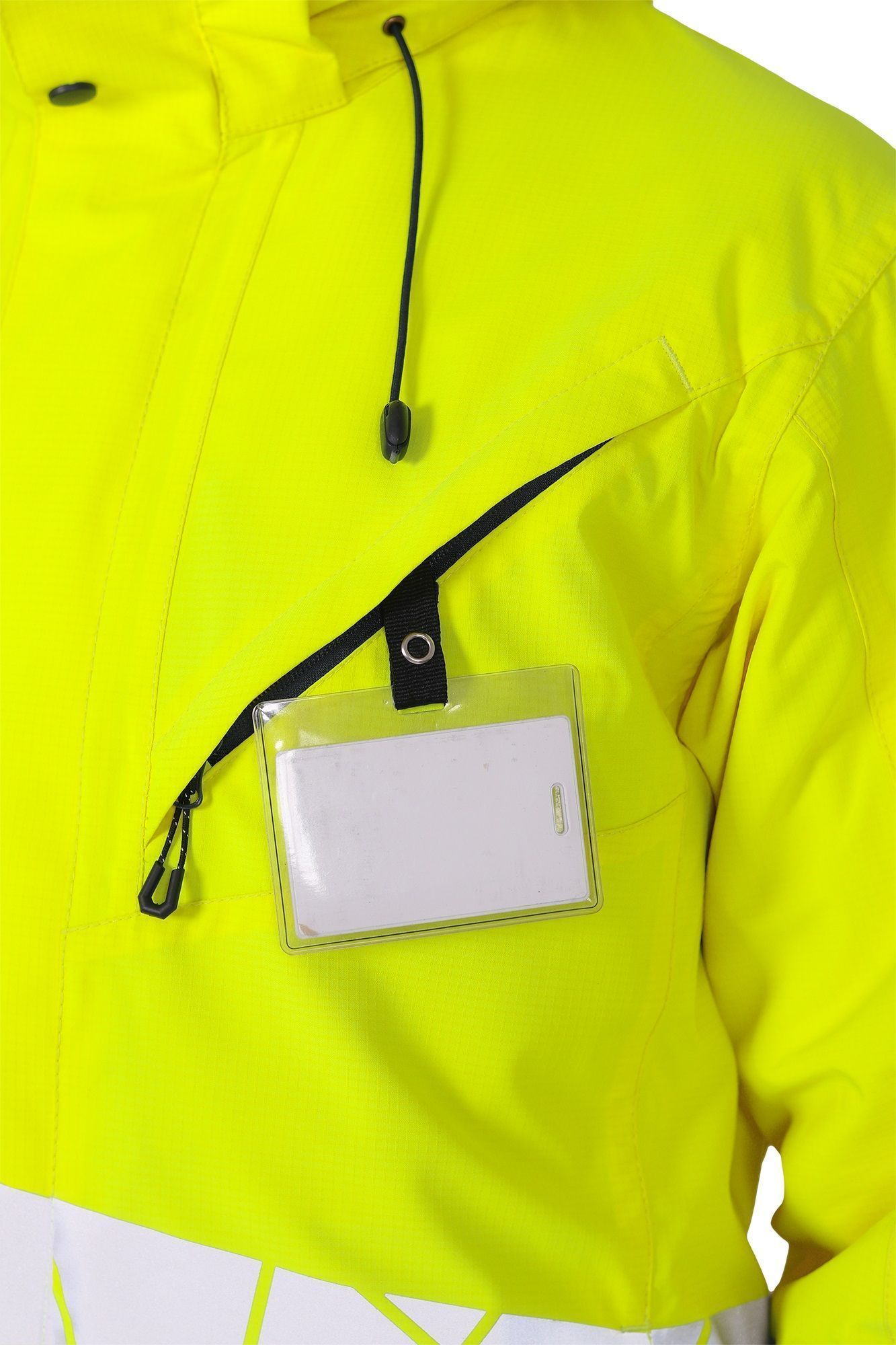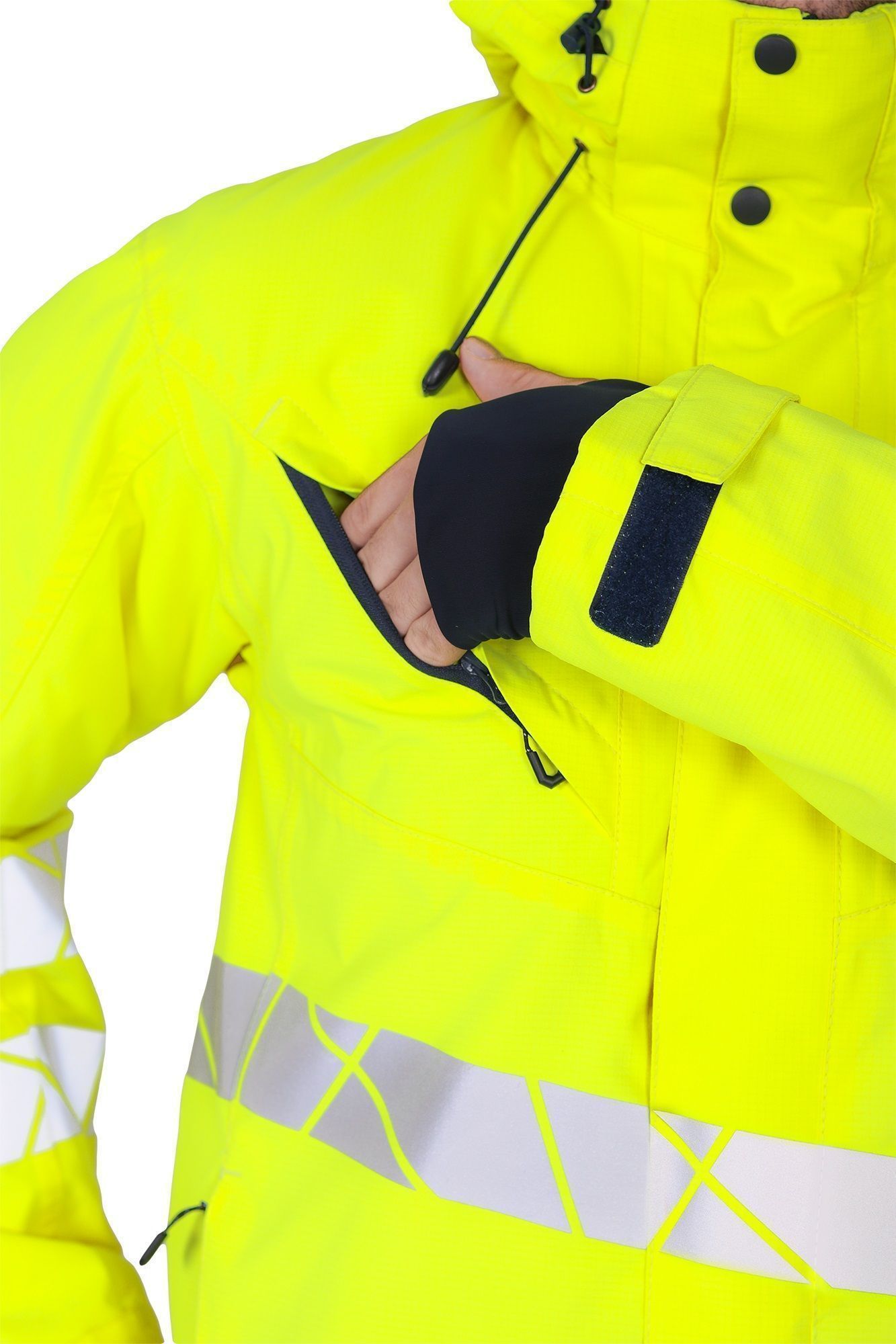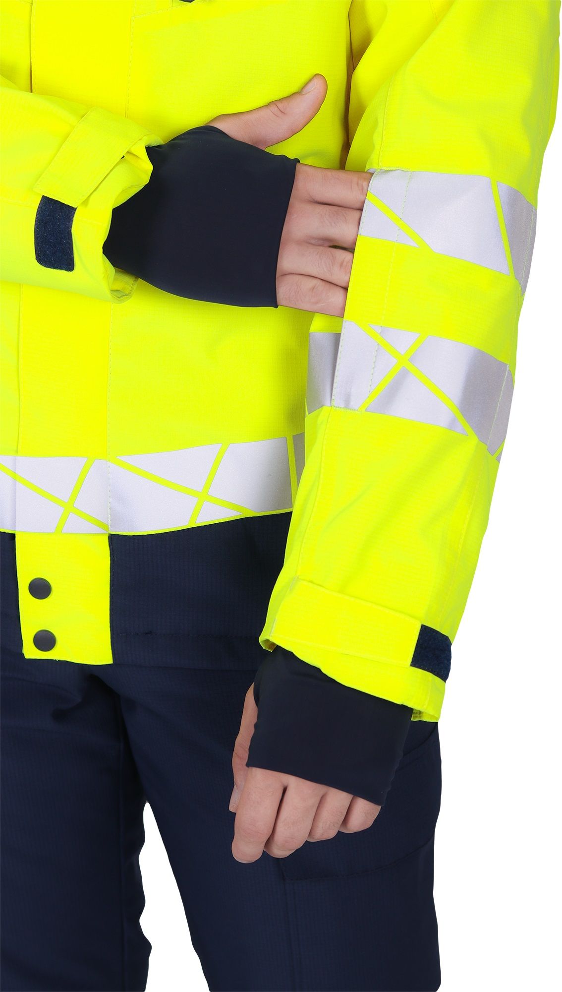 • две охватывающие термолкеевые световозвращающие полосы шириной 50 мм по торсу куртки и рукавам
