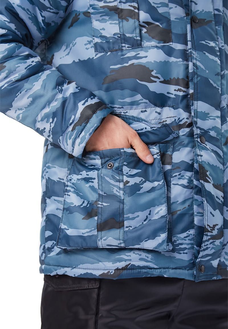 Экипировка работников охранных структур – куртка с утеплителем удлинённая. Отложной воротник отстёгиваемый (искусственный мех), отстёгивающийся капюшон. Погоны с кнопочной застёжкой. Куртка застёгивается на молнию (скрытого типа), по линии пояса – кулиска. Имеются пара карманов на груди, снабжённых клапанами, и пара по бокам. Рукава заканчиваются манжетами на эластичной ленте.