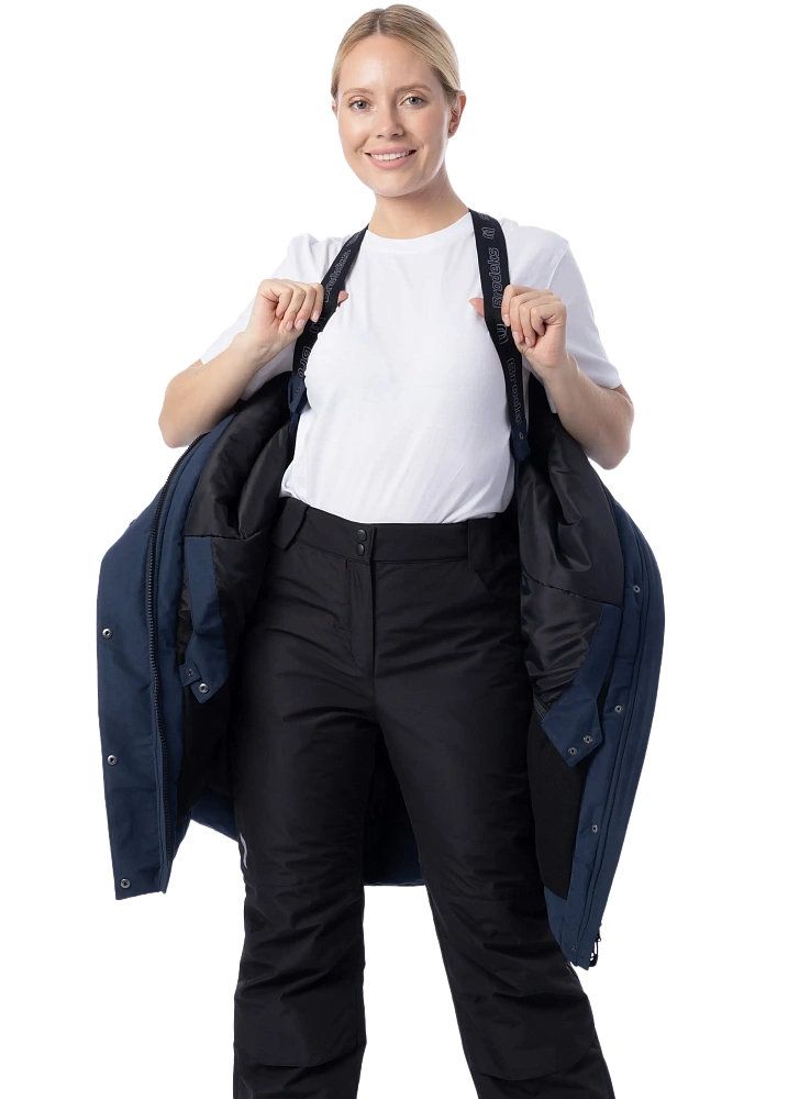 Брюки оснащены съёмной спинкой с эластичными подтяжками. Сзади она крепится на молнии, спереди к широким шлёвкам на липучках. Пояс завышен в области поясницы и имеет эластичные вставки по бокам. Это обеспечивает комфортную посадку и защиту от продувания. Колени скроены анатомически, что даёт свободу движений. Предусмотрены отделения под наколенники с нижней загрузкой. По низу брюк в боковых швах расположены молнии. С их помощью можно увеличить объём или быстро переобуться, не снимая одежду. В брюках есть два кармана для рук и два задних кармана. Левый набедренный карман объёмный и застёгивается на молнию. Справа расположен накладной карман для инструментов с двумя входами. Также есть петля для подвеса инструментов.